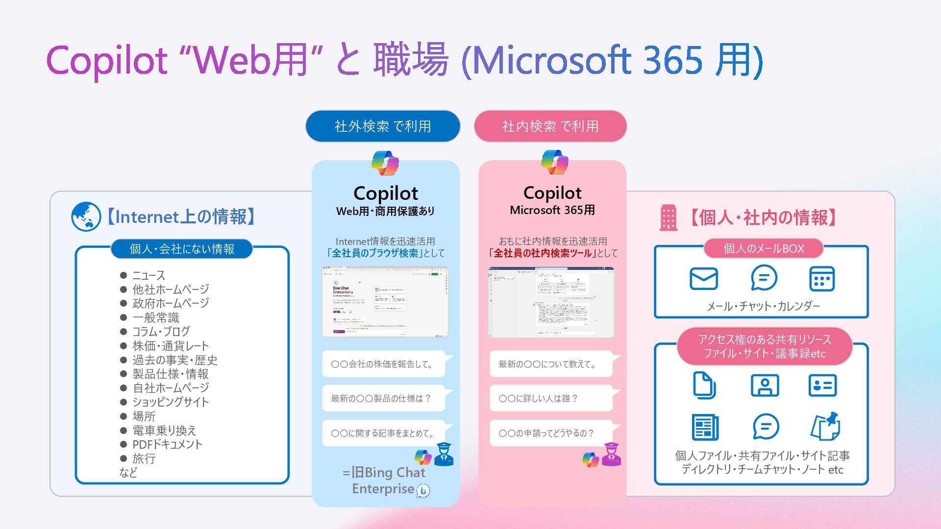 〇〇会社の株価を報告して。 Internet情報を迅速活用 「全社員のブラウザ検索」として 最新の〇〇製品の仕様は? 〇〇に関する記事をまとめて。 社外検索 で利用 Copilot Microsoft 365用 最新の〇〇について教えて。 おもに社内情報を迅速活用 「全社員の社内検索ツール」として 〇〇に詳しい人は誰? 〇〇の申請ってどうやるの? 社内検索 で利用 【Internet上の情報】 【個人・社内の情報】 個人のメールBOX アクセス権のある共有リソース ファイル・サイト・議事録etc メール・チャット・カレンダー 個人ファイル・共有ファイル・サイト記事 ディレクトリ・チームチャット・ノート etc 個人・会社にない情報 ⚫ ニュース ⚫ 他社ホームページ ⚫ 政府ホームページ ⚫ 一般常識 ⚫ コラム・ブログ ⚫ 株価・通貨レート ⚫ 過去の事実・歴史 ⚫ 製品仕様・情報 ⚫ 自社ホームページ ⚫ ショッピングサイト ⚫ 場所 ⚫ 電車乗り換え ⚫ PDFドキュメント ⚫ 旅行 など Copilot Web用・商用保護あり
