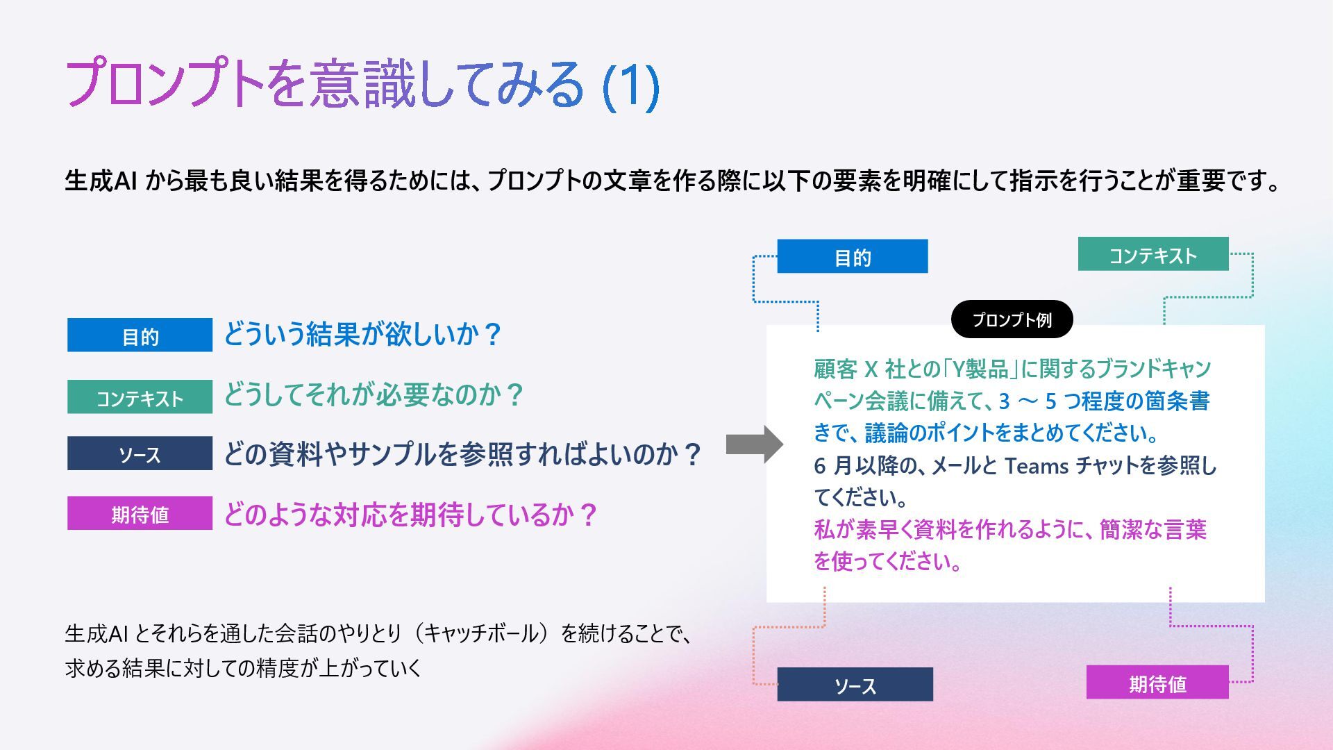 ペーン会議に備えて、3 ~ 5 つ程度の箇条書 きで、議論のポイントをまとめてください。 6 月以降の、メールと Teams チャットを参照し てください。 私が素早く資料を作れるように、簡潔な言葉 を使ってください。 目的 コンテキスト ソース 期待値 どういう結果が欲しいか? どうしてそれが必要なのか? どの資料やサンプルを参照すればよいのか? どのような対応を期待しているか? ソース 期待値 コンテキスト 目的 プロンプト例
