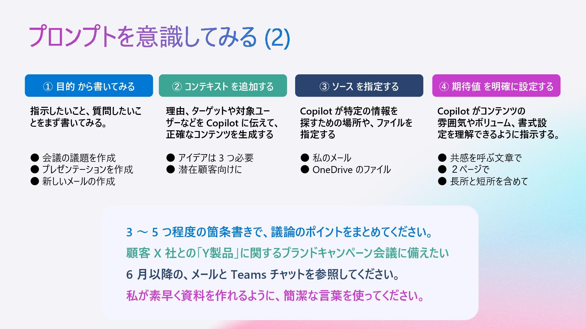 を追加する ① 目的 から書いてみる 指示したいこと、質問したいこ とをまず書いてみる。 • 会議の議題を作成 • プレゼンテーションを作成 • 新しいメールの作成 理由、ターゲットや対象ユー ザーなどを Copilot に伝えて、 正確なコンテンツを生成する • アイデアは 3 つ必要 • 潜在顧客向けに Copilot が特定の情報を 探すための場所や、ファイルを 指定する • 私のメール • OneDrive のファイル Copilot がコンテンツの 雰囲気やボリューム、書式設 定を理解できるように指示する。 • 共感を呼ぶ文章で • 2ページで • 長所と短所を含めて 3 ~ 5 つ程度の箇条書きで、議論のポイントをまとめてください。 顧客 X 社との「Y製品」に関するブランドキャンペーン会議に備えたい 6 月以降の、メールと Teams チャットを参照してください。 私が素早く資料を作れるように、簡潔な言葉を使ってください。
