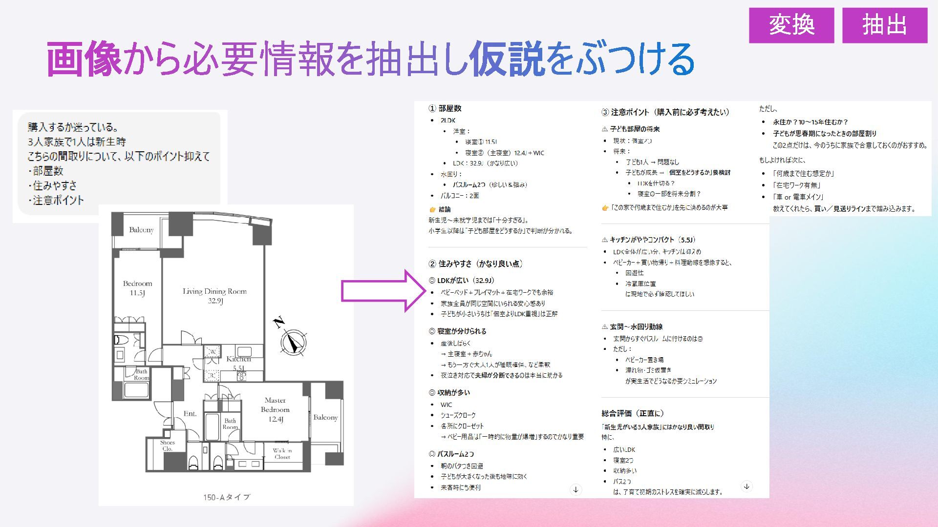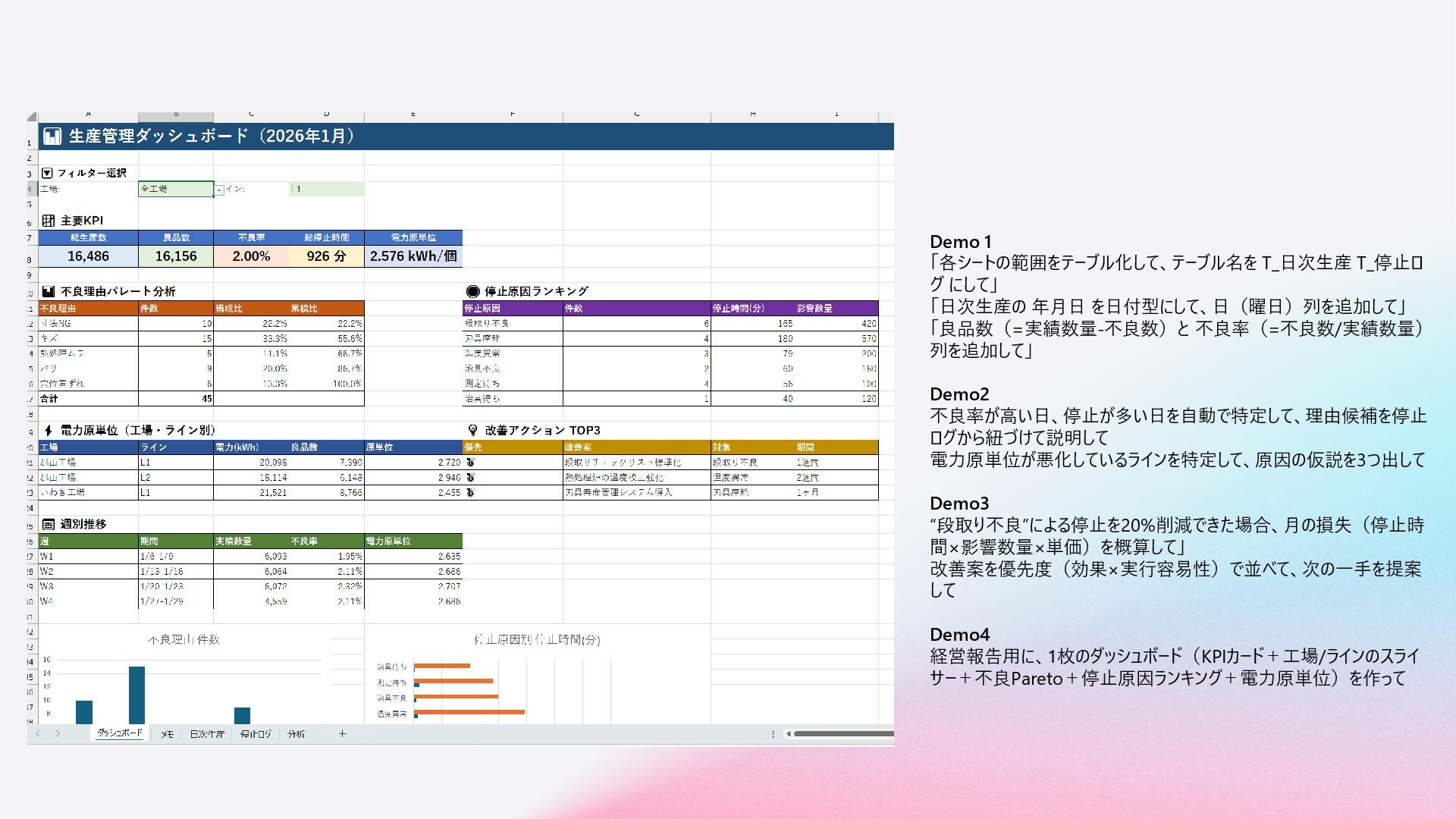 「良品数(=実績数量-不良数)と 不良率(=不良数/実績数量) 列を追加して」 Demo2 不良率が高い日、停止が多い日を自動で特定して、理由候補を停止 ログから紐づけて説明して 電力原単位が悪化しているラインを特定して、原因の仮説を3つ出して Demo3 “段取り不良”による停止を20%削減できた場合、月の損失(停止時 間×影響数量×単価)を概算して」 改善案を優先度(効果×実行容易性)で並べて、次の一手を提案 して Demo4 経営報告用に、1枚のダッシュボード(KPIカード+工場/ラインのスライ サー+不良Pareto+停止原因ランキング+電力原単位)を作って