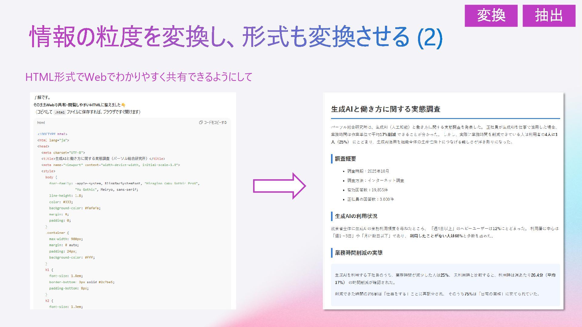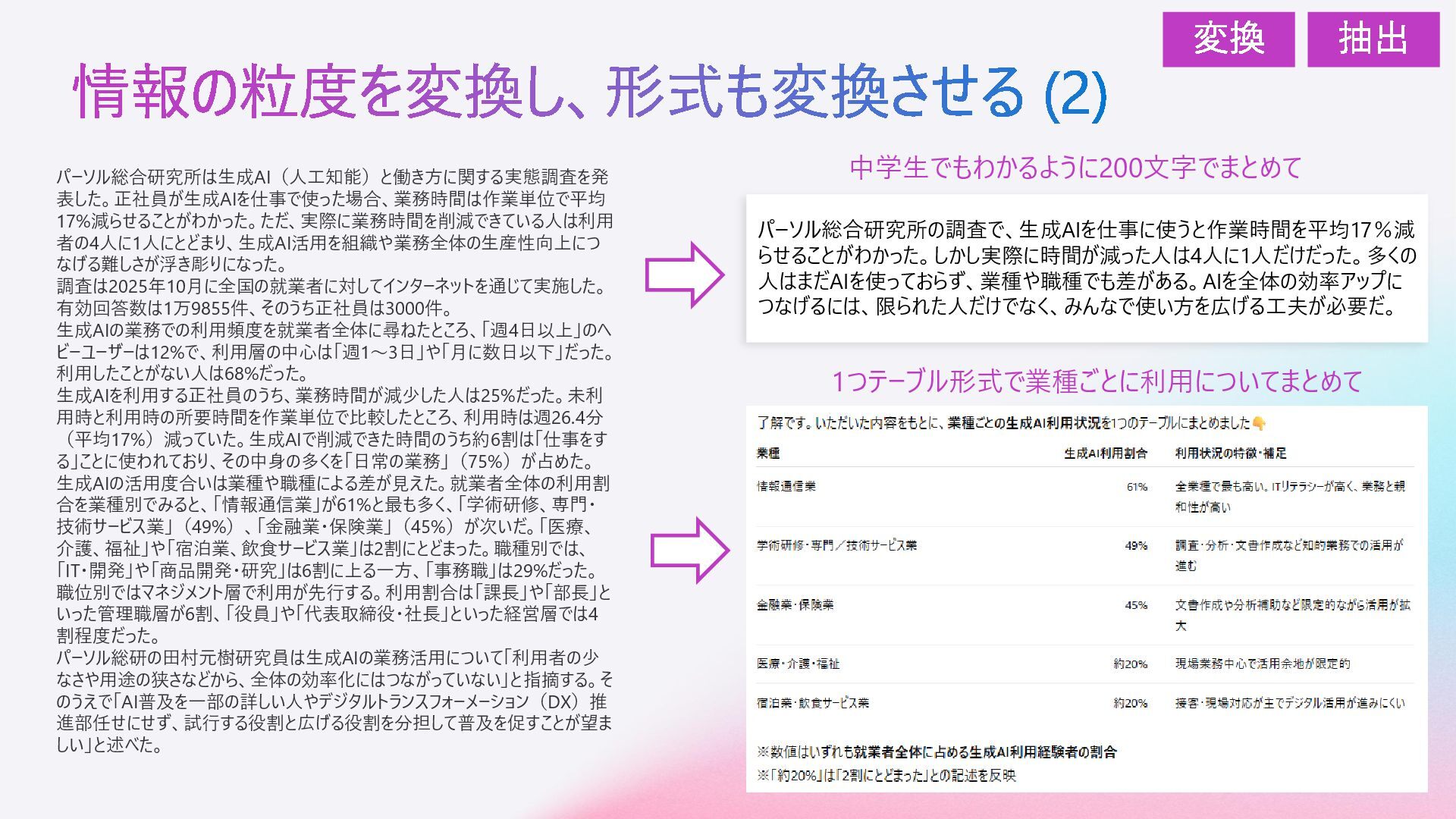 9. 情報の粒度を変換し、形式も変換させる (2) 変換 抽出 パーソル総合研究所は生成AI(人工知能)と働き方に関する実態調査を発 表した。正社員が生成AIを仕事で使った場合、業務時間は作業単位で平均 17%減らせることがわかった。ただ、実際に業務時間を削減できている人は利用 者の4人に1人にとどまり、生成AI活用を組織や業務全体の生産性向上につ なげる難しさが浮き彫りになった。 調査は2025年10月に全国の就業者に対してインターネットを通じて実施した。