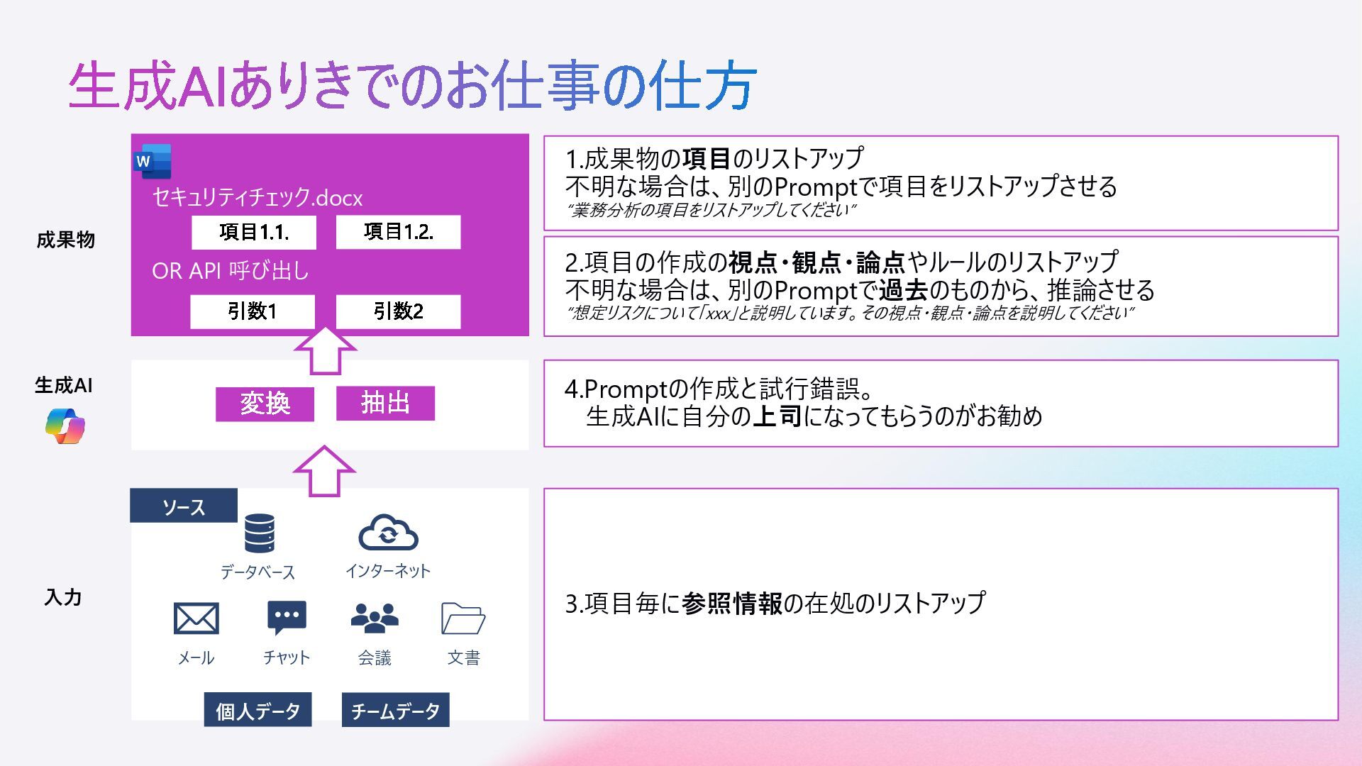 抽出 生成AI 成果物 セキュリティチェック.docx OR API 呼び出し 項目1.1. 項目1.2. 引数1 引数2 1.成果物の項目のリストアップ 不明な場合は、別のPromptで項目をリストアップさせる “業務分析の項目をリストアップしてください” 2.項目の作成の視点・観点・論点やルールのリストアップ 不明な場合は、別のPromptで過去のものから、推論させる “想定リスクについて「xxx」と説明しています。その視点・観点・論点を説明してください” 3.項目毎に参照情報の在処のリストアップ 4.Promptの作成と試行錯誤。 生成AIに自分の上司になってもらうのがお勧め 個人データ チームデータ
