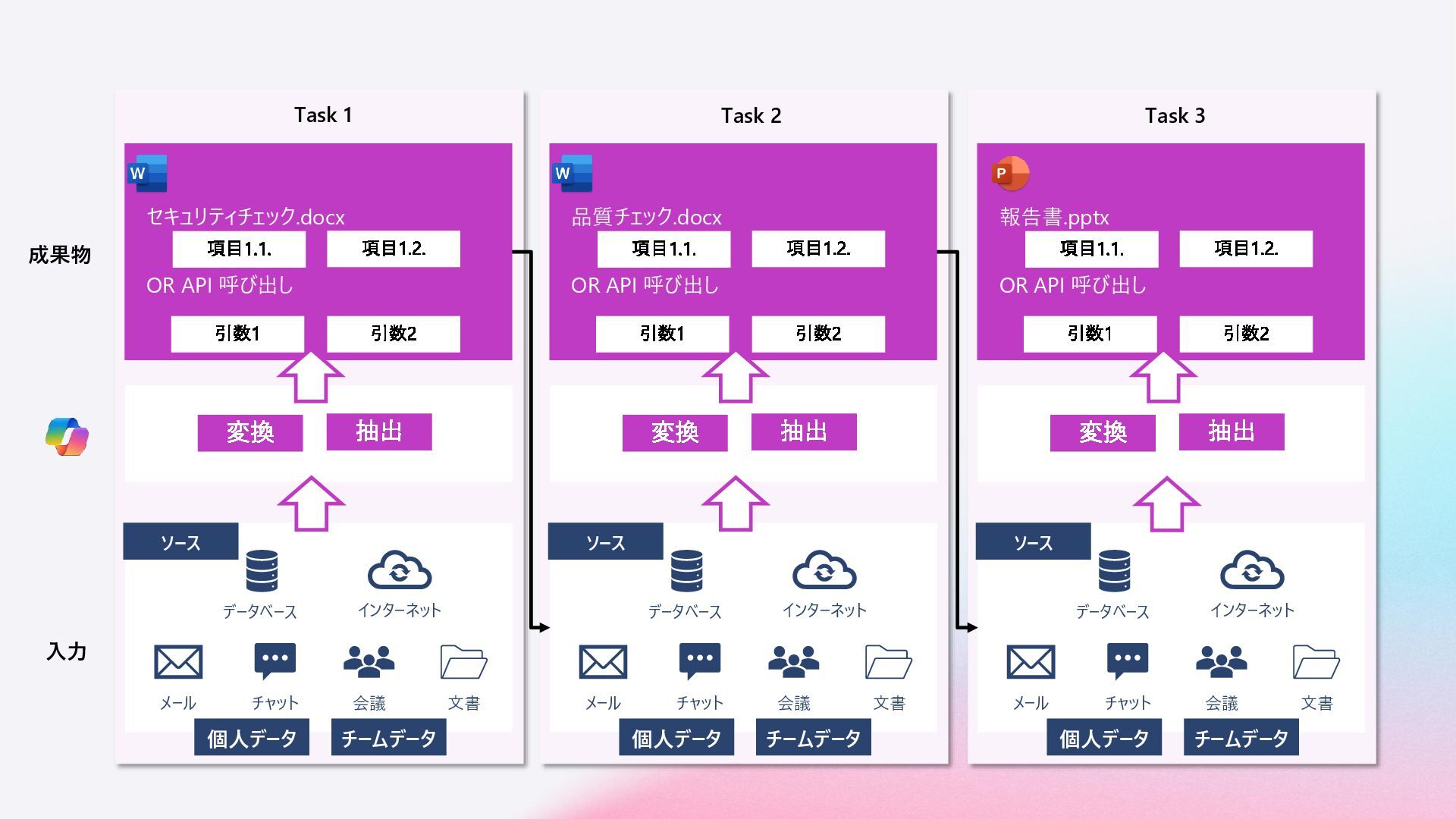 OR API 呼び出し 項目1.1. 項目1.2. 引数1 引数2 個人データ チームデータ Task 1 入力 成果物 メール 会議 チャット インターネット データベース 文書 ソース 変換 抽出 品質チェック.docx OR API 呼び出し 項目1.1. 項目1.2. 引数1 引数2 個人データ チームデータ Task 2 メール 会議 チャット インターネット データベース 文書 ソース 変換 抽出 報告書.pptx OR API 呼び出し 項目1.1. 項目1.2. 引数1 引数2 個人データ チームデータ Task 3