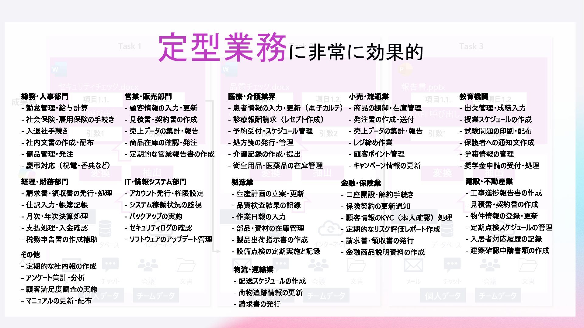 OR API 呼び出し 項目1.1. 項目1.2. 引数1 引数2 個人データ チームデータ Task 1 入力 成果物 メール 会議 チャット インターネット データベース 文書 ソース 変換 抽出 品質チェック.docx OR API 呼び出し 項目1.1. 項目1.2. 引数1 引数2 個人データ チームデータ Task 2 メール 会議 チャット インターネット データベース 文書 ソース 変換 抽出 報告書.pptx OR API 呼び出し 項目1.1. 項目1.2. 引数1 引数2 個人データ チームデータ Task 3 定型業務に非常に効果的 総務・人事部門 - 勤怠管理・給与計算 - 社会保険・雇用保険の手続き - 入退社手続き - 社内文書の作成・配布 - 備品管理・発注 - 慶弔対応(祝電・香典など) 経理・財務部門 - 請求書・領収書の発行・処理 - 仕訳入力・帳簿記帳 - 月次・年次決算処理 - 支払処理・入金確認 - 税務申告書の作成補助 営業・販売部門 - 顧客情報の入力・更新 - 見積書・契約書の作成 - 売上データの集計・報告 - 商品在庫の確認・発注 - 定期的な営業報告書の作成 IT・情報システム部門 - アカウント発行・権限設定 - システム稼働状況の監視 - バックアップの実施 - セキュリティログの確認 - ソフトウェアのアップデート管理 物流・運輸業 - 配送スケジュールの作成 - 荷物追跡情報の更新 - 請求書の発行 医療・介護業界 - 患者情報の入力・更新(電子カルテ) - 診療報酬請求(レセプト作成) - 予約受付・スケジュール管理 - 処方箋の発行・管理 - 介護記録の作成・提出 - 衛生用品・医薬品の在庫管理 製造業 - 生産計画の立案・更新 - 品質検査結果の記録 - 作業日報の入力 - 部品・資材の在庫管理 - 製品出荷指示書の作成 - 設備点検の定期実施と記録 小売・流通業 - 商品の棚卸・在庫管理 - 発注書の作成・送付 - 売上データの集計・報告 - レジ締め作業 - 顧客ポイント管理 - キャンペーン情報の更新 金融・保険業 - 口座開設・解約手続き - 保険契約の更新通知 - 顧客情報のKYC(本人確認)処理 - 定期的なリスク評価レポート作成 - 請求書・領収書の発行 - 金融商品説明資料の作成 教育機関 - 出欠管理・成績入力 - 授業スケジュールの作成 - 試験問題の印刷・配布 - 保護者への通知文作成 - 学籍情報の管理 - 奨学金申請の受付・処理 建設・不動産業 - 工事進捗報告書の作成 - 見積書・契約書の作成 - 物件情報の登録・更新 - 定期点検スケジュールの管理 - 入居者対応履歴の記録 - 建築確認申請書類の作成 その他 - 定期的な社内報の作成 - アンケート集計・分析 - 顧客満足度調査の実施 - マニュアルの更新・配布