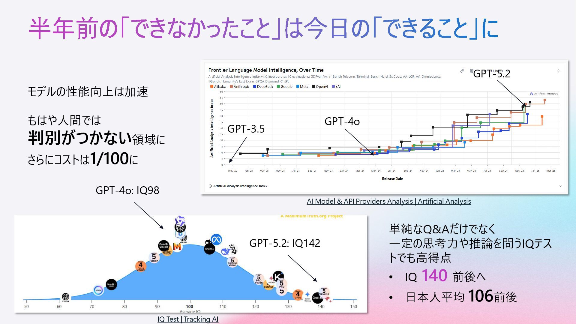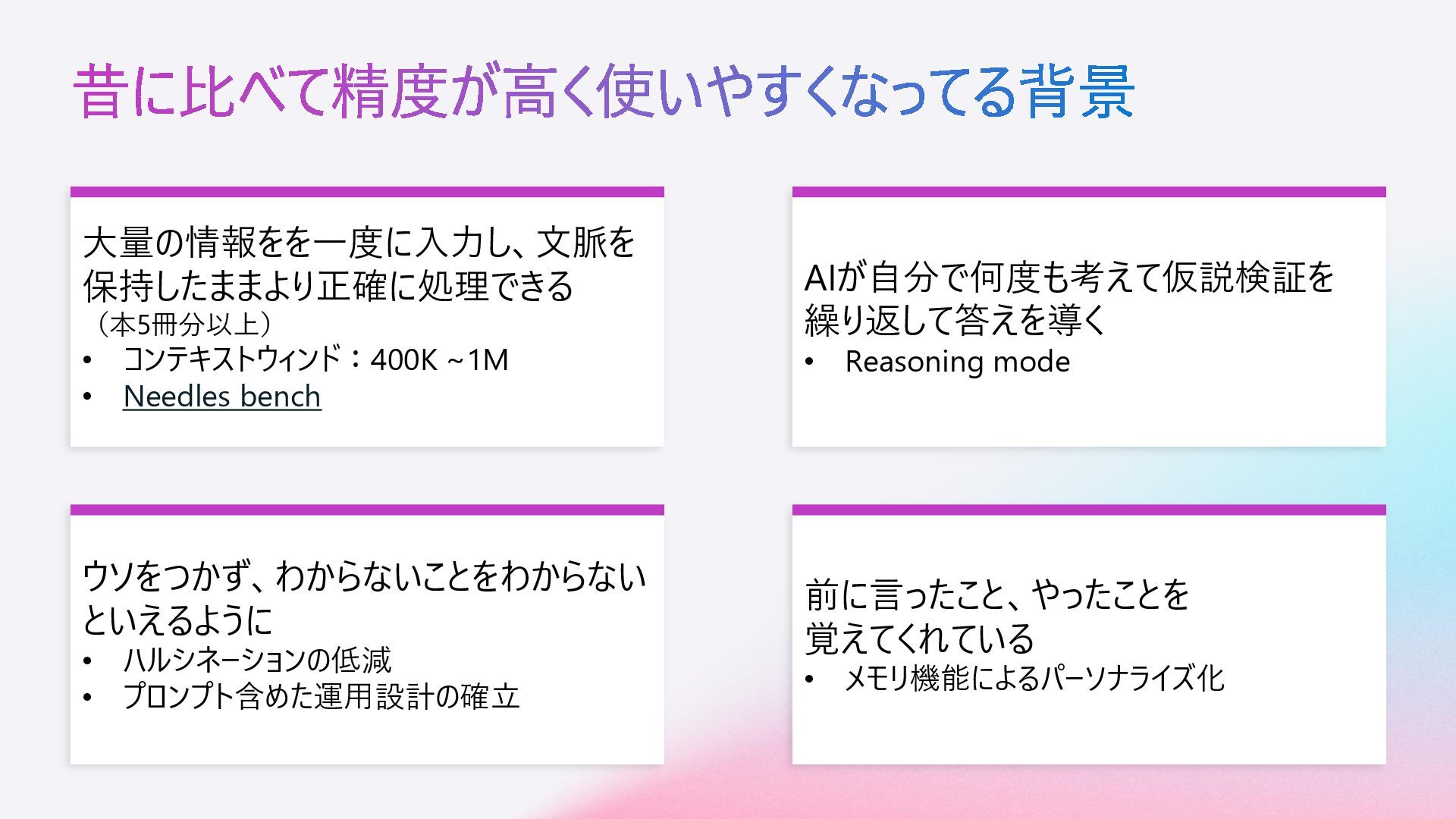 AIが自分で何度も考えて仮説検証を 繰り返して答えを導く • Reasoning mode 前に言ったこと、やったことを 覚えてくれている • メモリ機能によるパーソナライズ化 ウソをつかず、わからないことをわからない といえるように • ハルシネーションの低減 • プロンプト含めた運用設計の確立