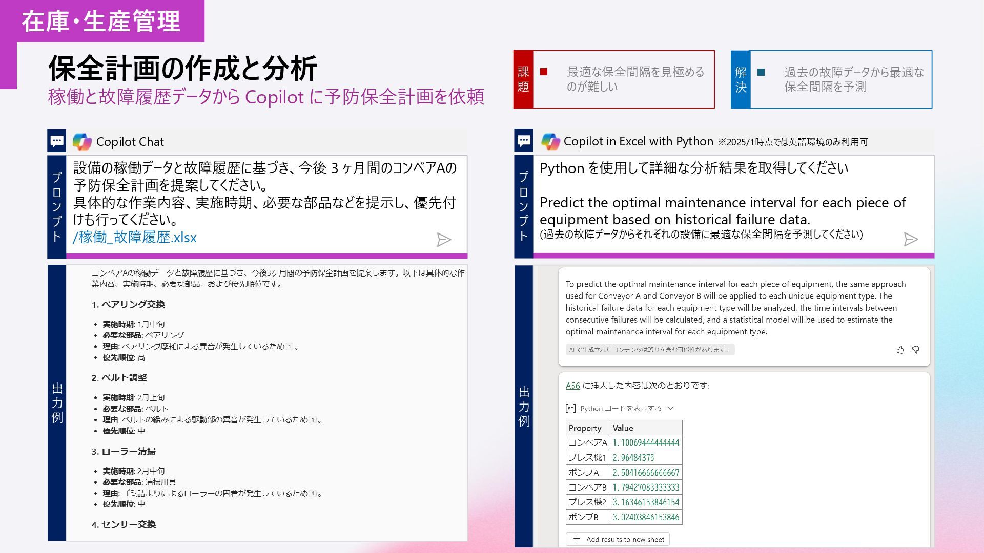 /稼働_故障履歴.xlsx Copilot Chat プ ロ ン プ ト 出 力 例 Python を使用して詳細な分析結果を取得してください Predict the optimal maintenance interval for each piece of equipment based on historical failure data. (過去の故障データからそれぞれの設備に最適な保全間隔を予測してください) Copilot in Excel with Python ※2025/1時点では英語環境のみ利用可 プ ロ ン プ ト 出 力 例 ◼ 最適な保全間隔を見極める のが難しい 課 題 ◼ 過去の故障データから最適な 保全間隔を予測 解 決 在庫・生産管理