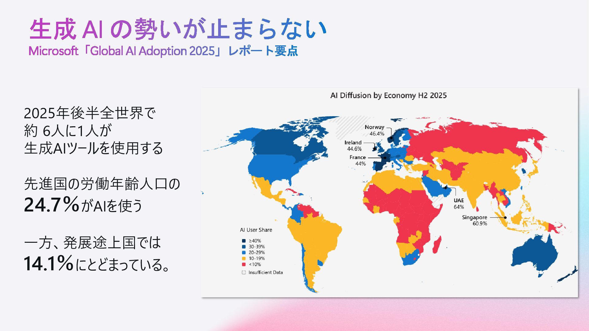 1. 生成 AI の勢いが止まらない Microsoft「Global AI Adoption 2025」レポート要点 2025年後半全世界で 約 6人に1人が
