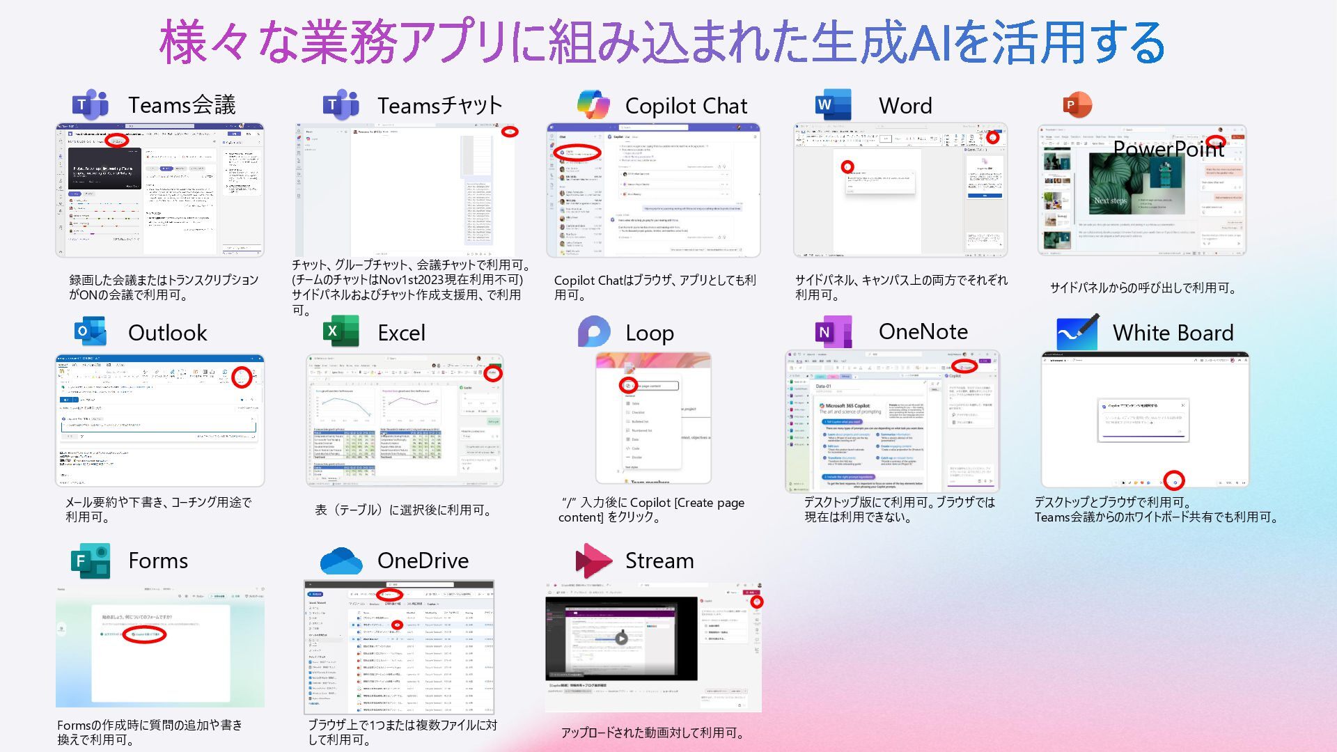 換えで利用可。 ブラウザ上で1つまたは複数ファイルに対 して利用可。 Forms OneDrive Stream アップロードされた動画対して利用可。 Copilot Chat Copilot Chatはブラウザ、アプリとしても利 用可。 Word サイドパネル、キャンパス上の両方でそれぞれ 利用可。 PowerPoint サイドパネルからの呼び出しで利用可。 Outlook メール要約や下書き、コーチング用途で 利用可。 Excel 表(テーブル)に選択後に利用可。 Loop “/” 入力後に Copilot [Create page content] をクリック。 OneNote デスクトップ版にて利用可。ブラウザでは 現在は利用できない。 White Board デスクトップとブラウザで利用可。 Teams会議からのホワイトボード共有でも利用可。
