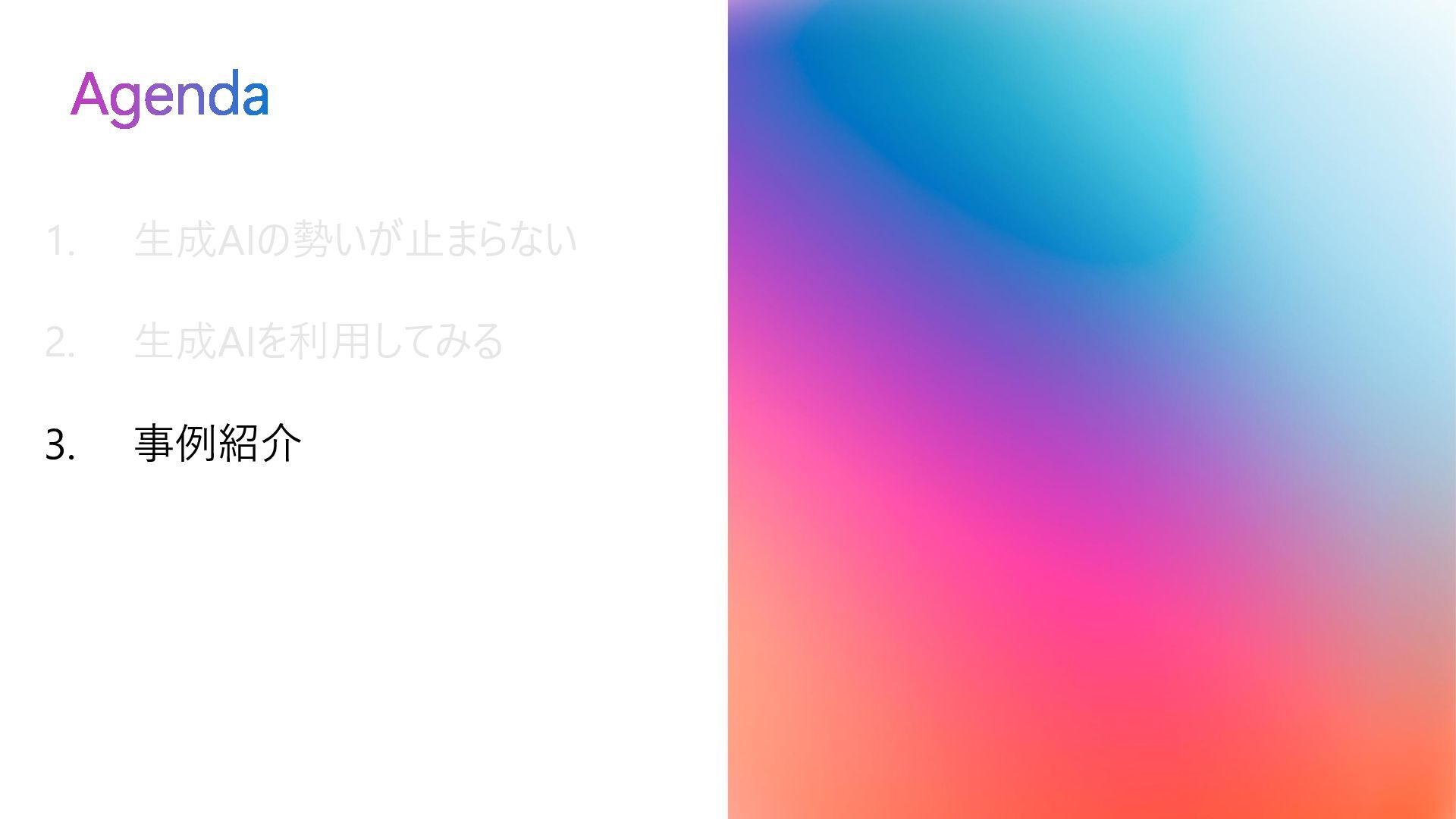 • OUTLOOKカレンダーに企業訪問の予定を入れる • エージェントが企業リサーチを開始 • 結果はメールで • 多言語のネイティブスピーカーが参加するTeams会議 • インタープリターを使えば韓国語や英語なども日本語に同時通訳 • インタープリターのサポート言語数は9 テキスト翻訳のサポート言語は60以上※2025年11月現在 • 出張時のレシートをTeamsのチャットへアップロード エージェントが内容を分析 • 基幹システムへデータが自動で送られ処理を開始 経費申請の時間が大幅削減 • Copilotに複数年分の資料をアップロード • 前年度と比較し分析したグラフからより絞った議論ができる • Viva Engageに自ら投稿している全社員向けメッセージ 入社直後から毎週かかさず投稿し9割の社員が読む • 投稿への反応をアナリストが分析 • 閲覧数やエンゲージメントの増減傾向やヒントを基に、コミュニケーション戦略を改善していく 商談準備エージェントが訪問予定の企業を自動でリサーチ インタープリターエージェントを使い多言語会議を同時通訳 経費精算エージェントで経費精算を自動化 会議中にCopilotで営業データを分析:担当営業との会議中に気になるお客様の傾向を発見 アナリストエージェントの分析を改善にいかす 日本マイクロソフト社長の Copilot 活用術 Vol.2|Meet my Copilot 1. 経営陣自らがAIを活用 2. AI ファーストでプロセスを刷新 3. AI 筋トレで成果を最大化 日本マイクロソフト社長の Copilot 活用術