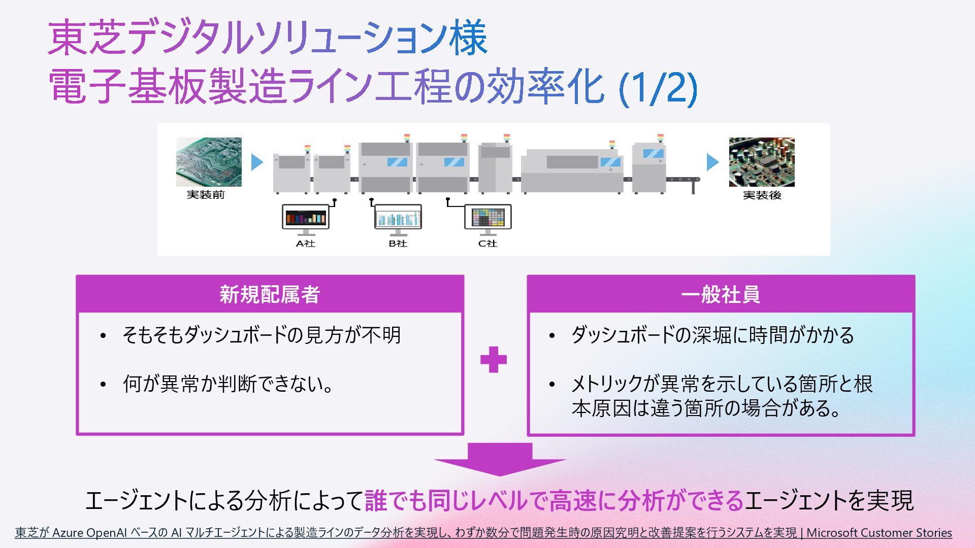 ダッシュボードの深堀に時間がかかる • メトリックが異常を示している箇所と根 本原因は違う箇所の場合がある。 エージェントによる分析によって誰でも同じレベルで高速に分析ができるエージェントを実現 東芝が Azure OpenAI ベースの AI マルチエージェントによる製造ラインのデータ分析を実現し、わずか数分で問題発生時の原因究明と改善提案を行うシステムを実現 | Microsoft Customer Stories