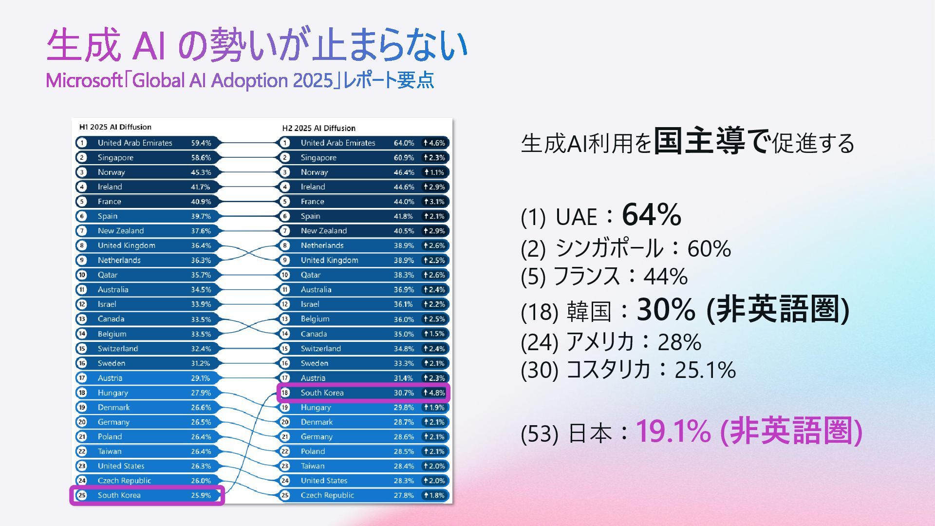 (24) アメリカ:28% (30) コスタリカ:25.1% (53) 日本:19.1% (非英語圏) 生成 AI の勢いが止まらない Microsoft「Global AI Adoption 2025」レポート要点