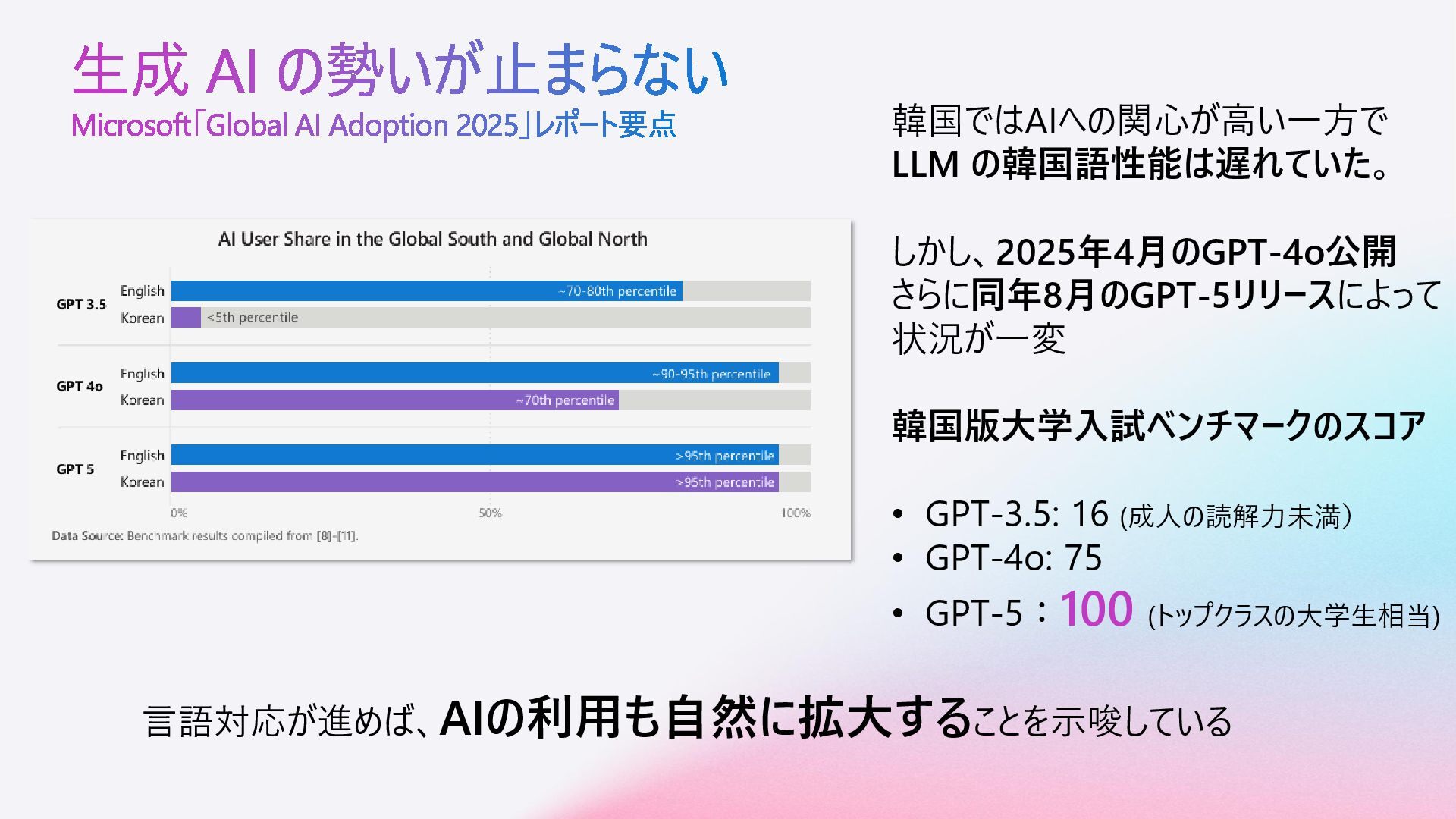 (成人の読解力未満) • GPT-4o: 75 • GPT-5:100 (トップクラスの大学生相当) 言語対応が進めば、AIの利用も自然に拡大することを示唆している 生成 AI の勢いが止まらない Microsoft「Global AI Adoption 2025」レポート要点
