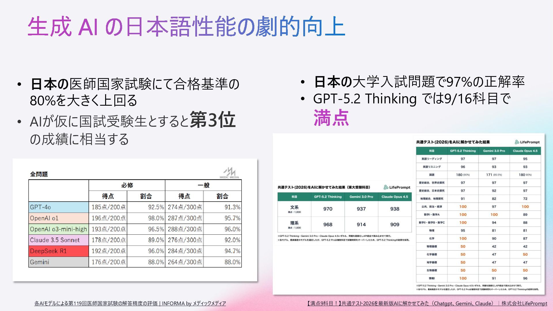 日本の医師国家試験にて合格基準の 80%を大きく上回る • AIが仮に国試受験生とすると第3位 の成績に相当する • 日本の大学入試問題で97%の正解率 • GPT-5.2 Thinking では9/16科目で 満点
