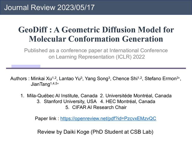 Molecular Conformation Generation Published as a conference paper at International Conference on Learning Representation (ICLR) 2022 Authors : Minkai Xu1,2, Lantao Yu3, Yang Song3, Chence Shi1,2, Stefano Ermon3∗, JianTang1,4,5∗ 1. Mila-Québec AI Institute, Canada 2. Universitéde Montréal, Canada 3. Stanford University, USA 4. HEC Montréal, Canada 5. CIFAR AI Research Chair Paper link : https://openreview.net/pdf?id=PzcvxEMzvQC Review by Daiki Koge (PhD Student at CSB Lab)