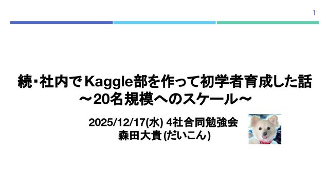 1 続・社内で Kaggle部を作って初学者育成した話 〜20名規模へのスケール〜 2025/12/17(水) 4社合同勉強会 森田大貴(だいこん)