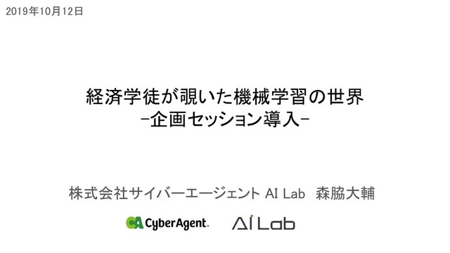 経済学徒が覗いた機械学習の世界 -企画セッション導入- 株式会社サイバーエージェント AI Lab 森脇大輔 2019年10月12日