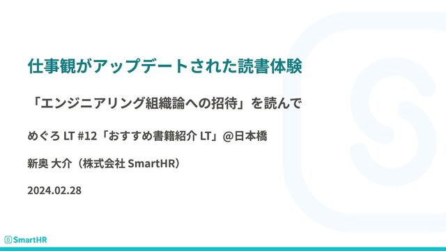 仕事観がアップデートされた読書体験 「エンジニアリング組織論への招待」を読んで めぐろ LT #12「おすすめ書籍紹介 LT」@日本橋 新奥 大介(株式会社 SmartHR) 2024.02.28