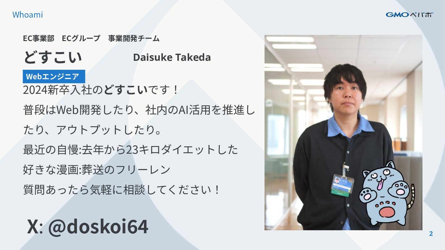 普段はWeb開発したり、社内のAI活⽤を推進し たり、アウトプットしたり。 最近の⾃慢:去年から23キロダイエットした 好きな漫画:葬送のフリーレン 質問あったら気軽に相談してください! Webエンジニア X: @doskoi64