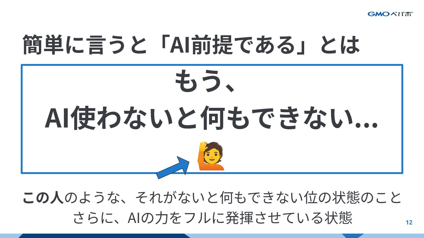 12 簡単に⾔うと「AI前提である」とは もう、 AI使わないと何もできない... 🙋 この⼈のような、それがないと何もできない位の状態のこと さらに、AIの⼒をフルに発揮させている状態 AI前提における前提とは