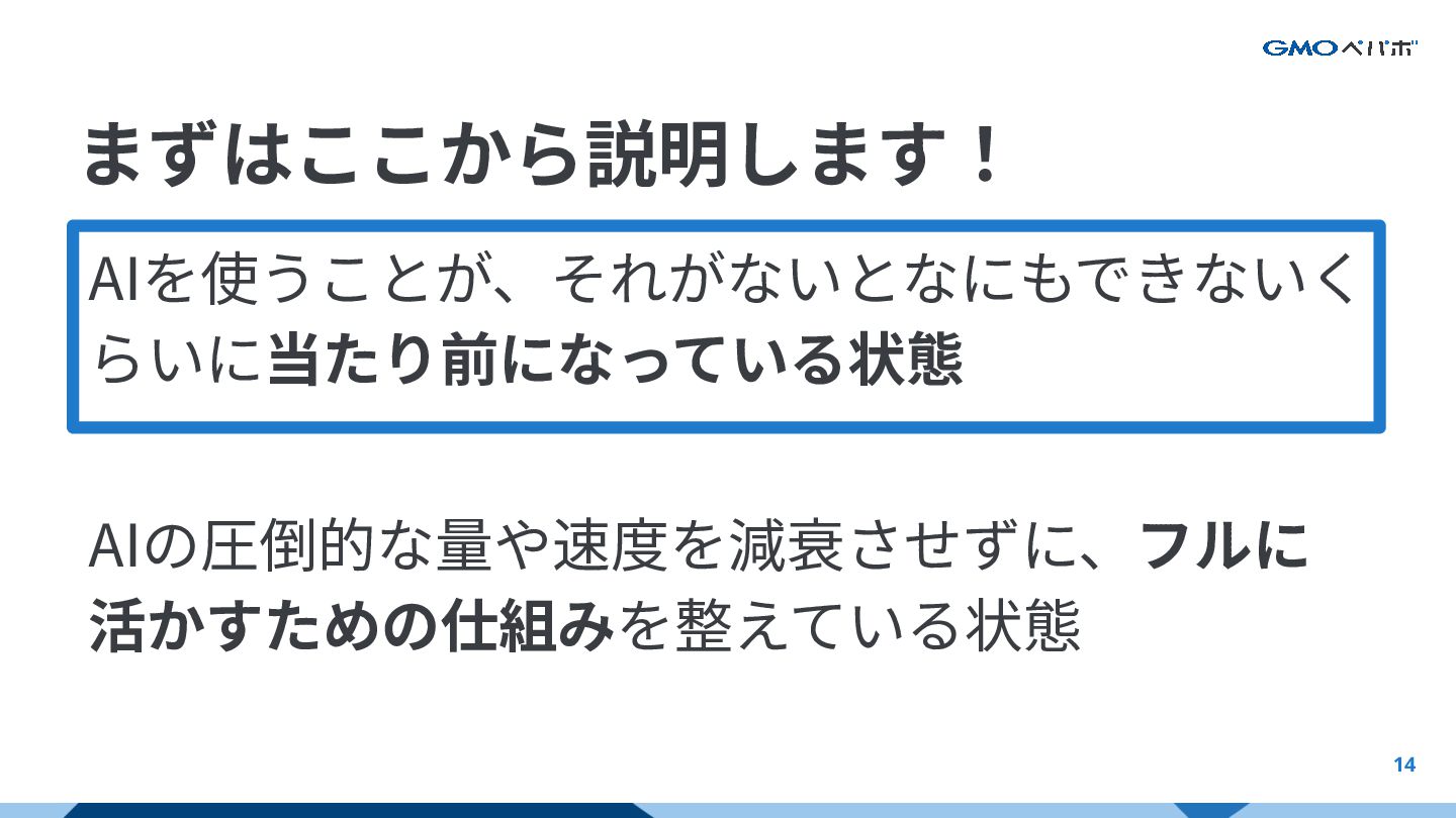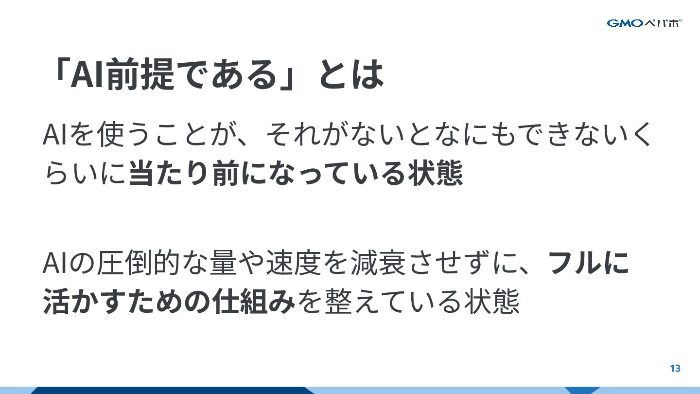 13 「AI前提である」とは AIを使うことが、それがないとなにもできないく らいに当たり前になっている状態 AIの圧倒的な量や速度を減衰させずに、フルに 活かすための仕組みを整えている状態 AI前提における前提とは