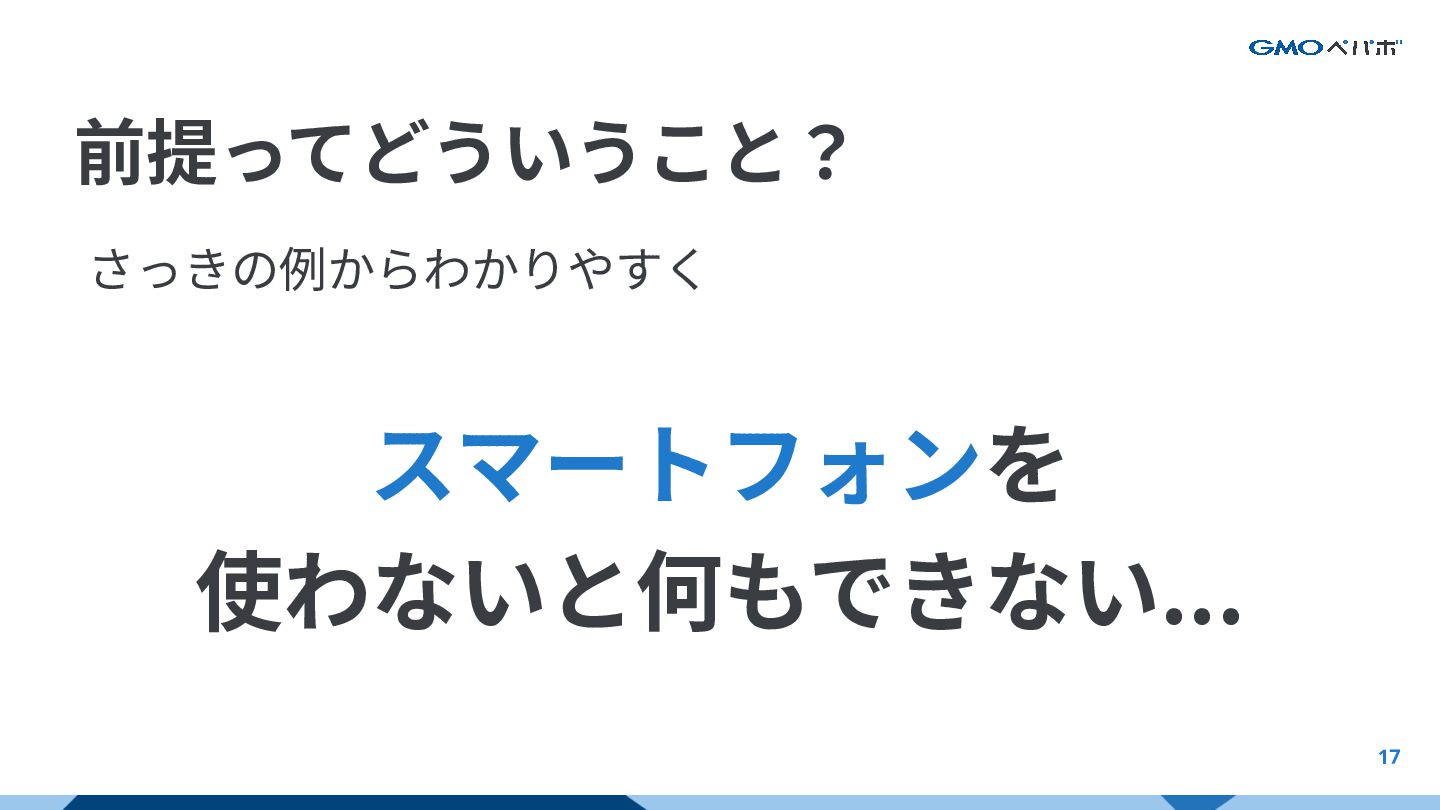 17 前提ってどういうこと? さっきの例からわかりやすく スマートフォンを 使わないと何もできない... AI前提における前提とは