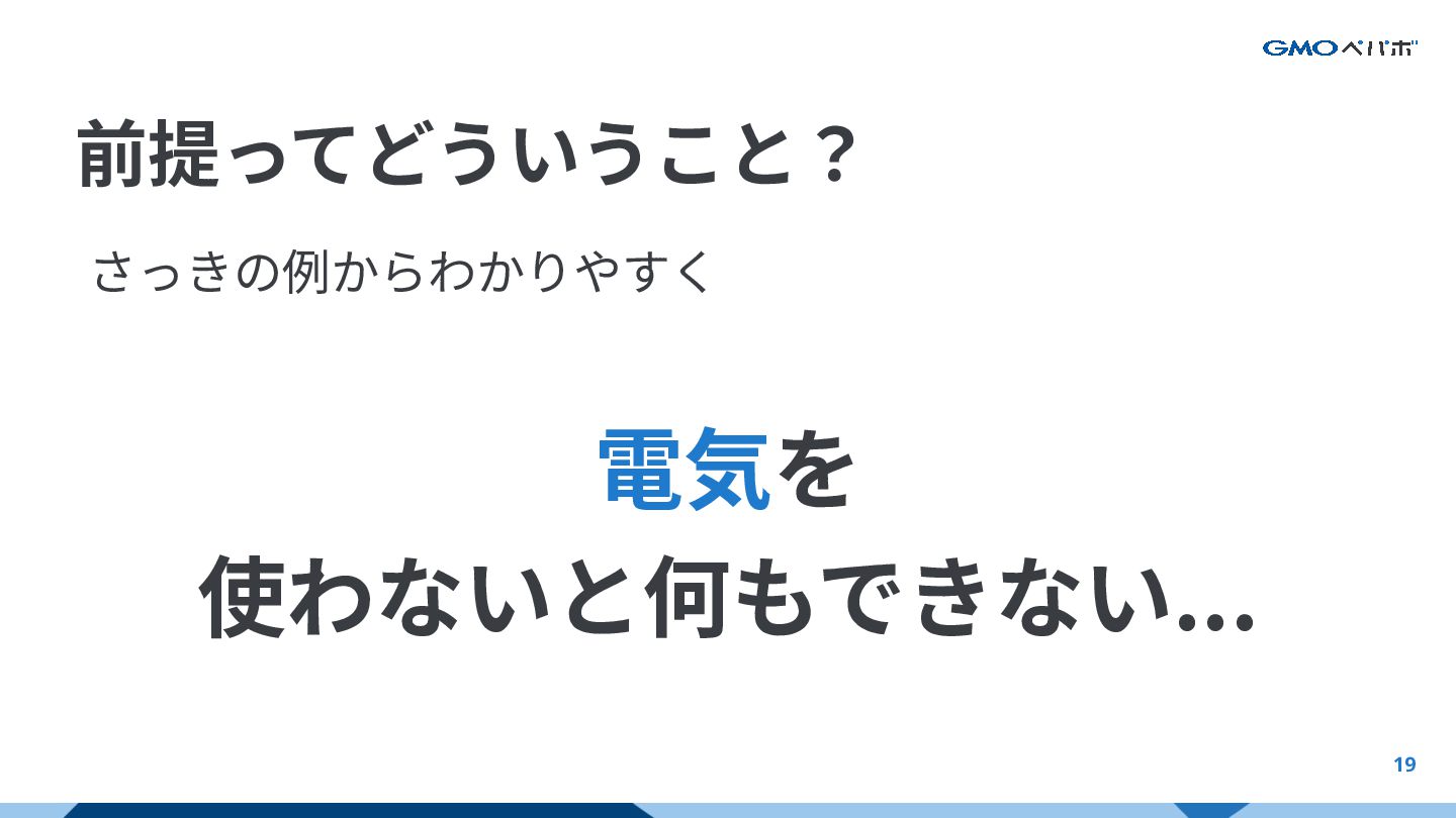 19 前提ってどういうこと? さっきの例からわかりやすく 電気を 使わないと何もできない... AI前提における前提とは