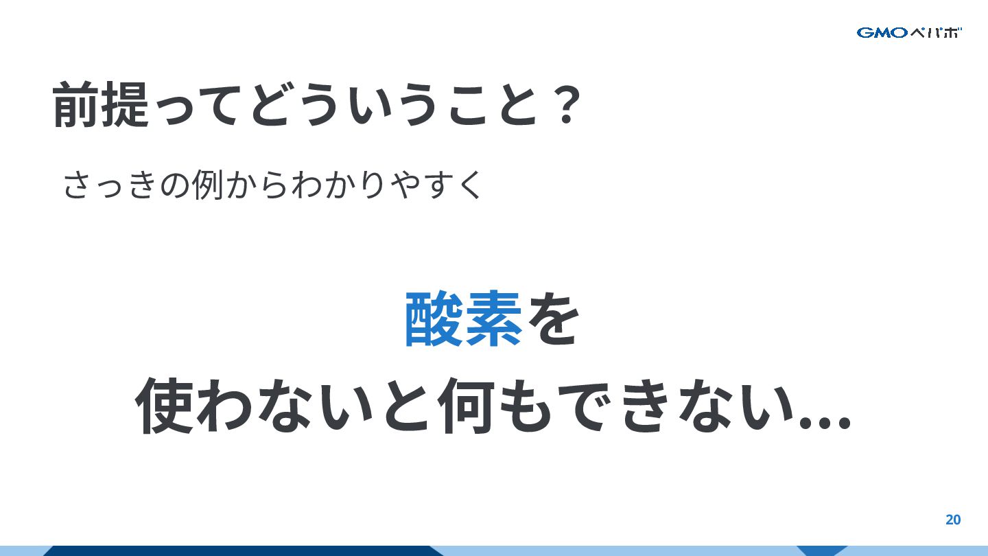 20 前提ってどういうこと? さっきの例からわかりやすく 酸素を 使わないと何もできない... AI前提における前提とは