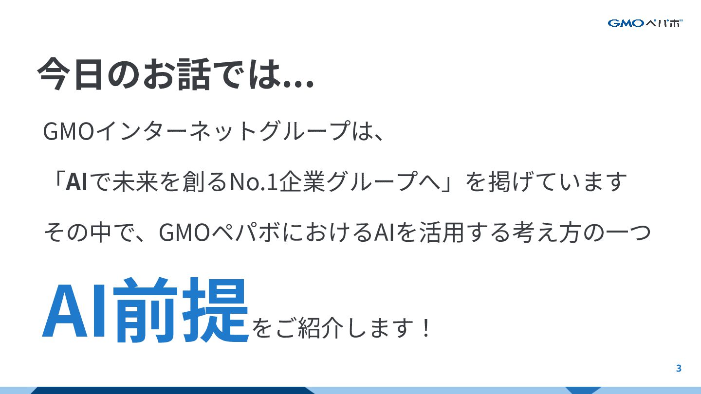 GMOインターネットグループは、 「AIで未来を創るNo.1企業グループへ」を掲げています その中で、GMOペパボにおけるAIを活⽤する考え⽅の⼀つ AI前提をご紹介します! 今⽇のお話では... 3 Introduction