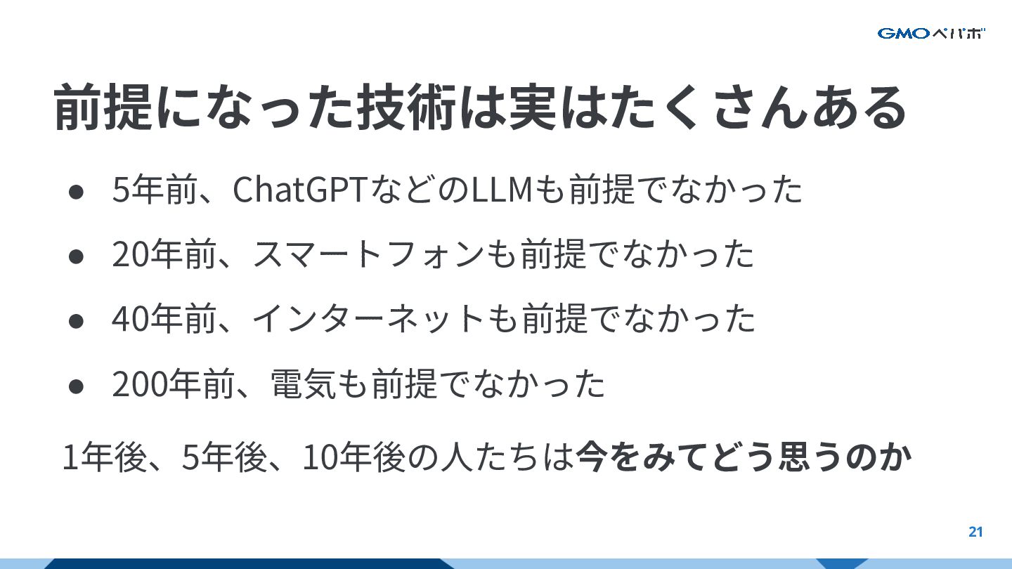 21 前提になった技術は実はたくさんある • 5年前、ChatGPTなどのLLMも前提でなかった • 20年前、スマートフォンも前提でなかった • 40年前、インターネットも前提でなかった • 200年前、電気も前提でなかった