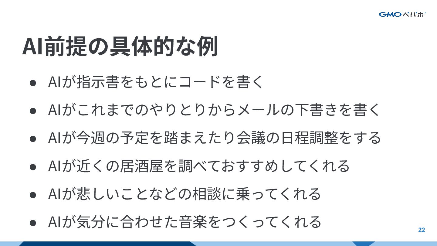 22 AI前提の具体的な例 • AIが指⽰書をもとにコードを書く • AIがこれまでのやりとりからメールの下書きを書く • AIが今週の予定を踏まえたり会議の⽇程調整をする • AIが近くの居酒屋を調べておすすめしてくれる