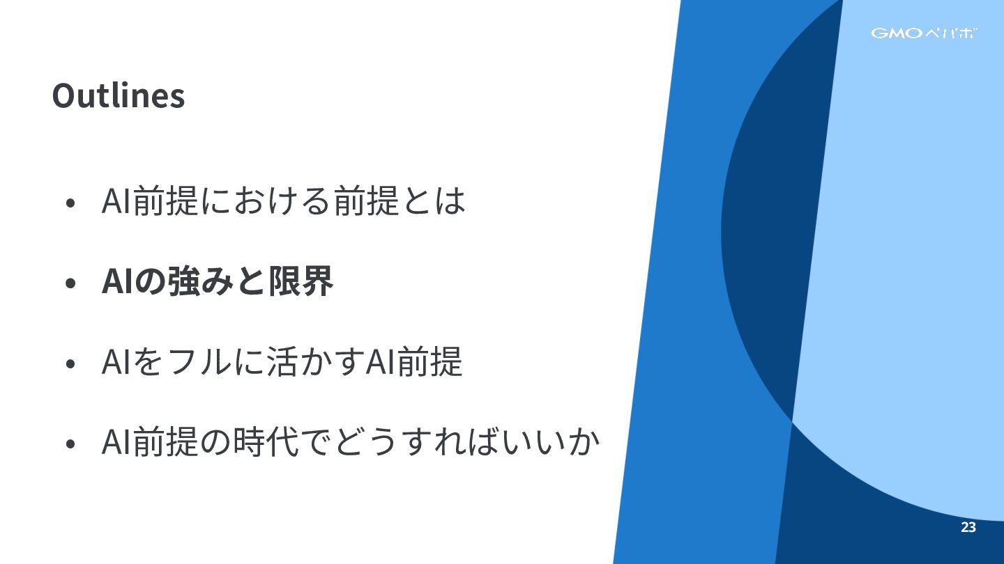 • AI前提における前提とは • AIの強みと限界 • AIをフルに活かすAI前提 • AI前提の時代でどうすればいいか Outlines 23