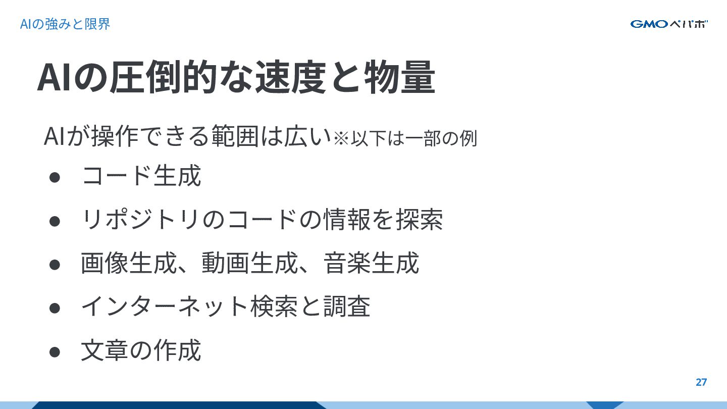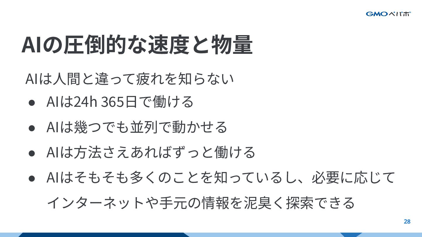 27 AIの圧倒的な速度と物量 AIが操作できる範囲は広い※以下は⼀部の例 • コード⽣成 • リポジトリのコードの情報を探索 • 画像⽣成、動画⽣成、⾳楽⽣成 •
