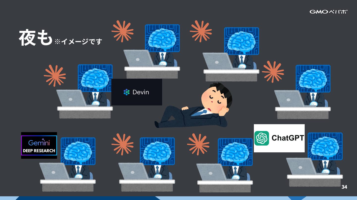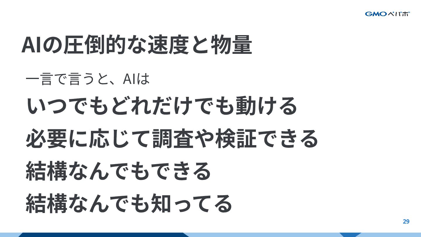 28 AIの圧倒的な速度と物量 AIは⼈間と違って疲れを知らない • AIは24h 365⽇で働ける • AIは幾つでも並列で動かせる • AIは⽅法さえあればずっと働ける