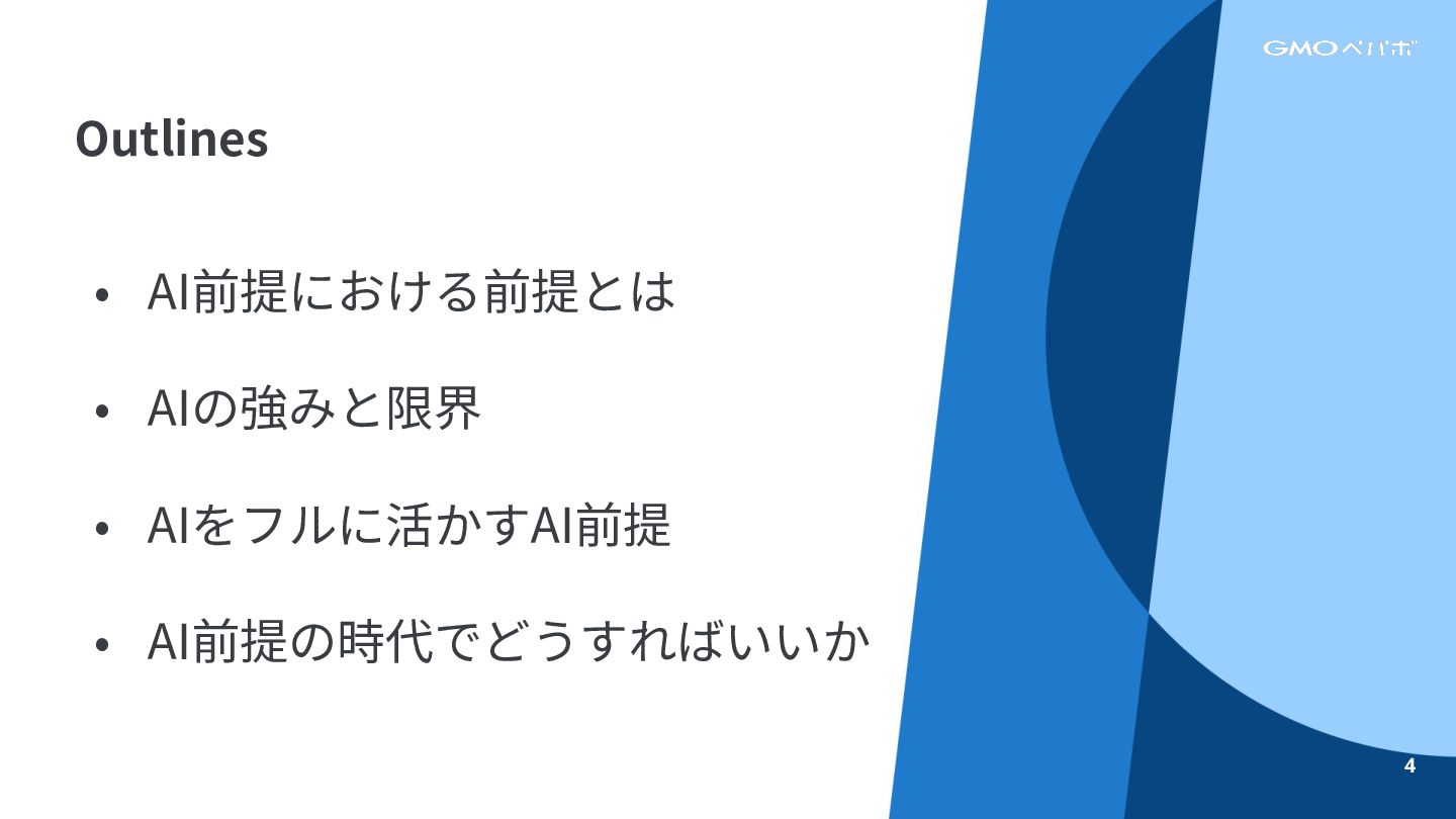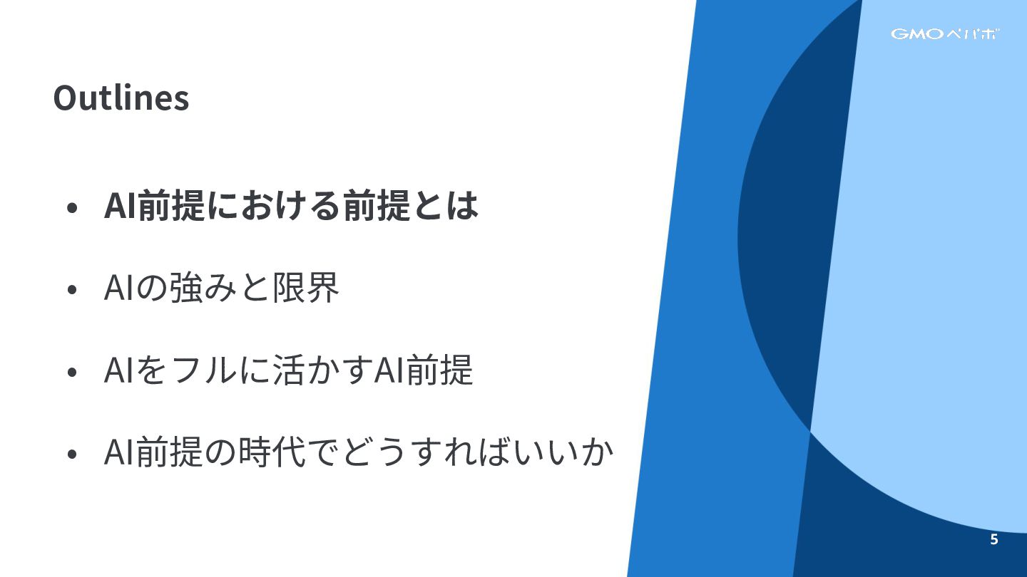 • AI前提における前提とは • AIの強みと限界 • AIをフルに活かすAI前提 • AI前提の時代でどうすればいいか Outlines 4