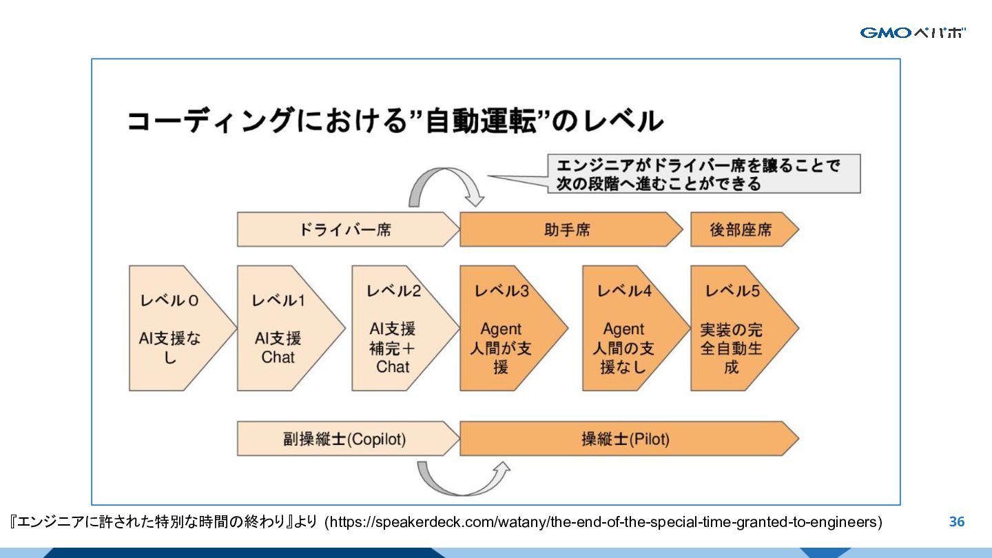 36 『エンジニアに許された特別な時間の終わり』より (https://speakerdeck.com/watany/the-end-of-the-special-time-granted-to-engineers) AIの強みと限界
