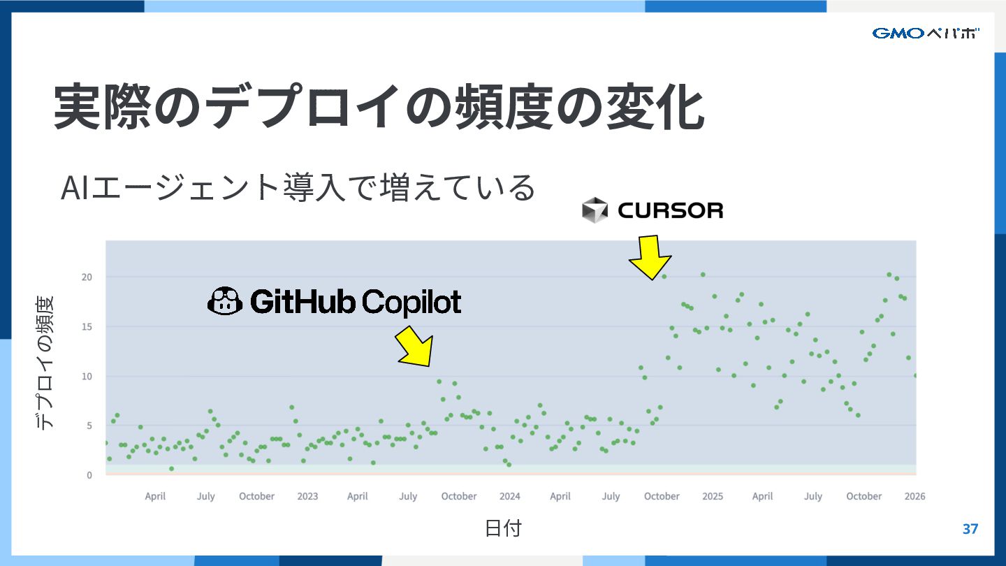 実際のデプロイの頻度の変化 37 AIエージェント導⼊で増えている ⽇付 デプロイの頻度 AIの強みと限界