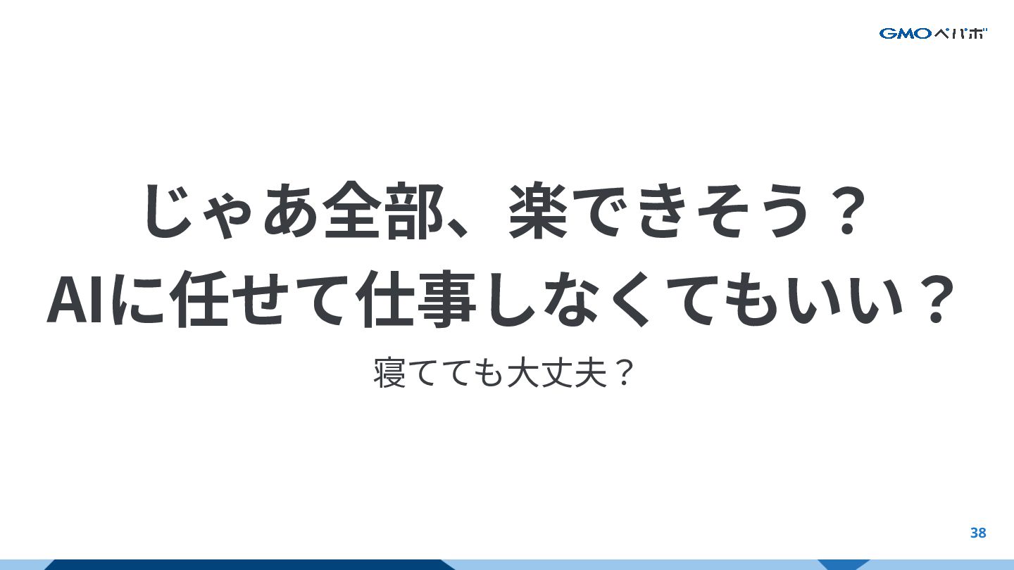 38 じゃあ全部、楽できそう? AIに任せて仕事しなくてもいい? 寝てても⼤丈夫? AIの強みと限界