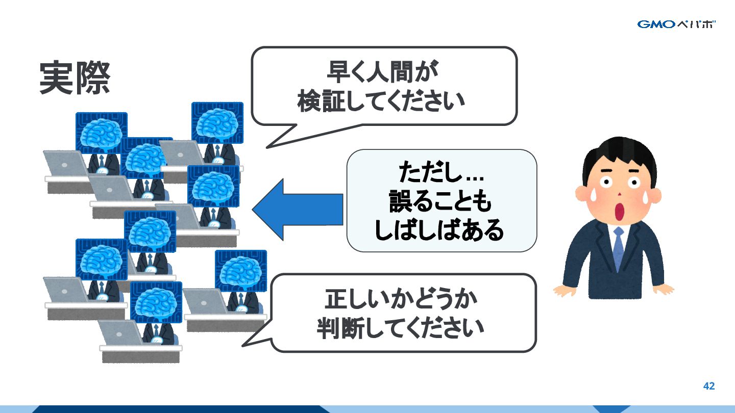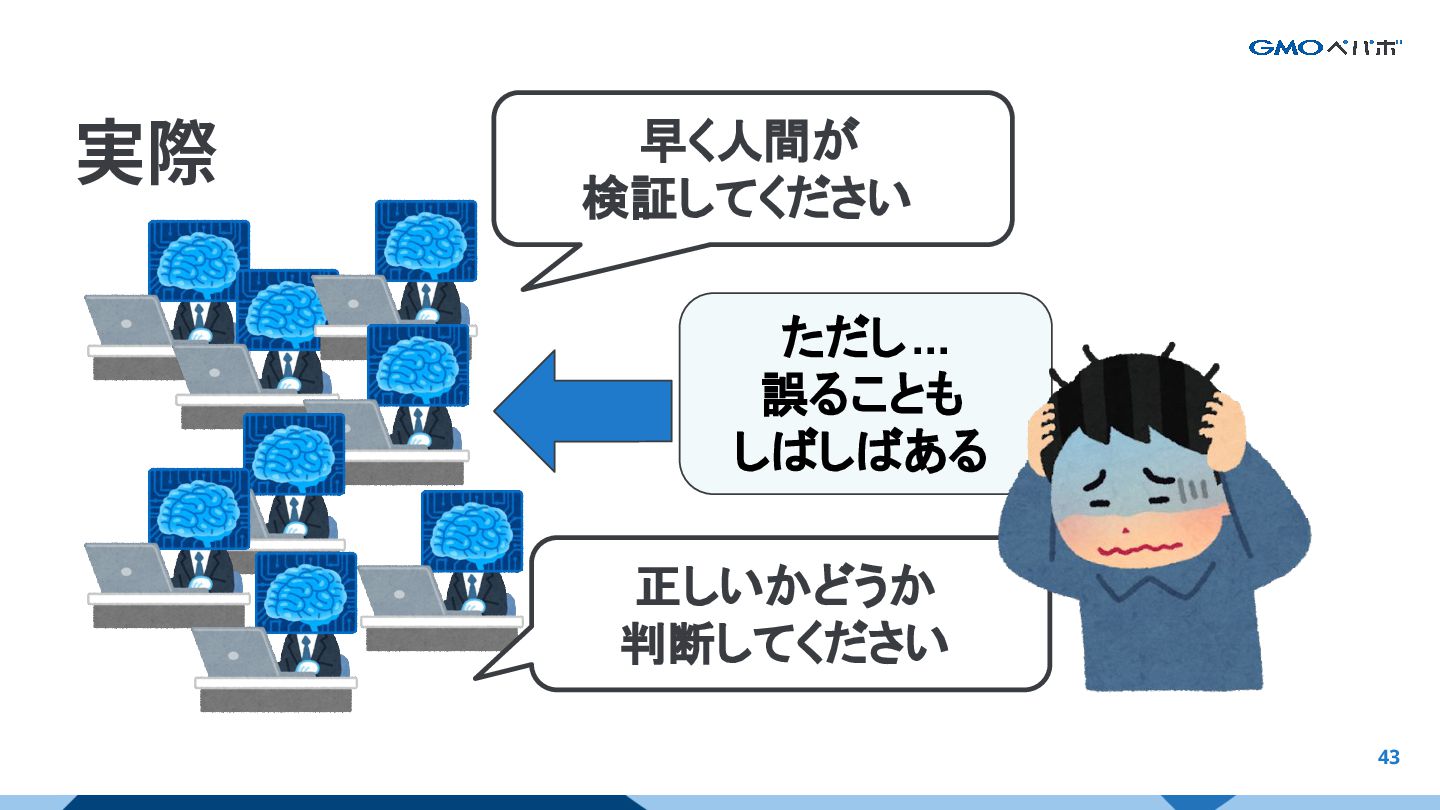 42 実際 早く人間が 検証してください 正しいかどうか 判断してください ただし... 誤ることも しばしばある AIの強みと限界
