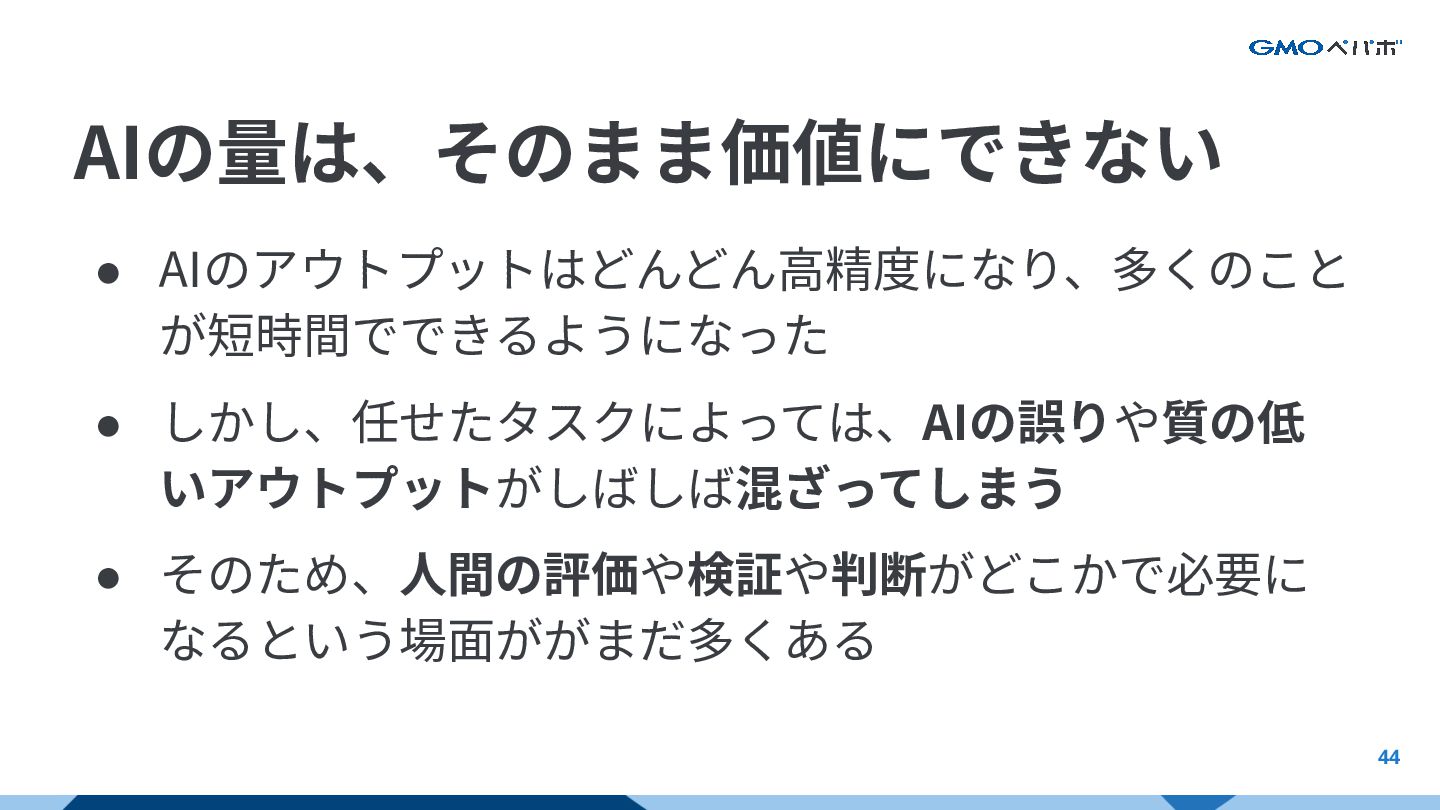 44 AIの量は、そのまま価値にできない • AIのアウトプットはどんどん⾼精度になり、多くのこと が短時間でできるようになった • しかし、任せたタスクによっては、AIの誤りや質の低 いアウトプットがしばしば混ざってしまう • そのため、⼈間の評価や検証や判断がどこかで必要に