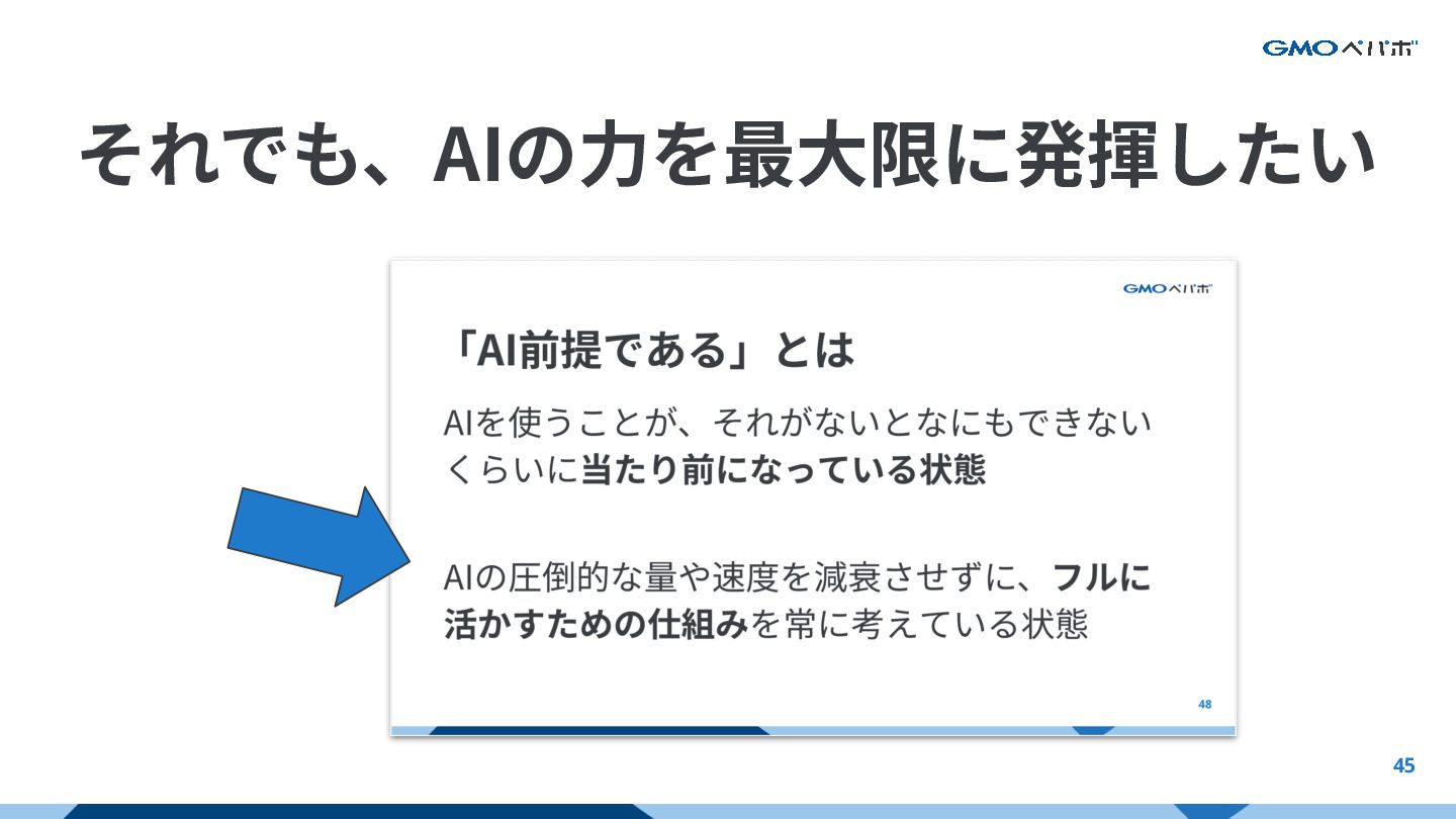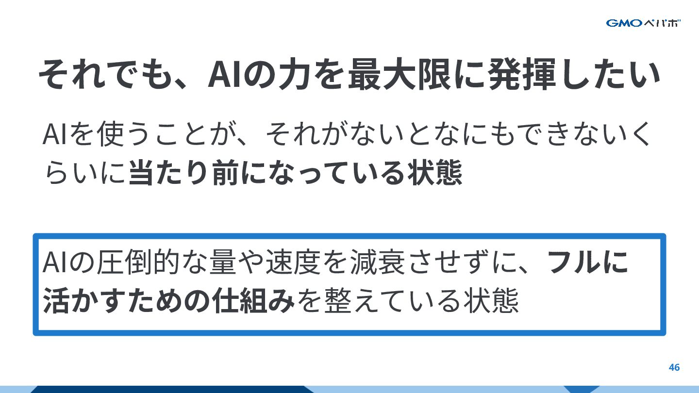 46 それでも、AIの⼒を最⼤限に発揮したい AIを使うことが、それがないとなにもできないく らいに当たり前になっている状態 AIの圧倒的な量や速度を減衰させずに、フルに 活かすための仕組みを整えている状態 AIの強みと限界