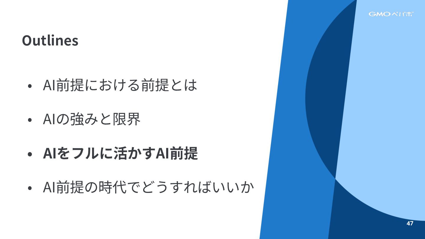 • AI前提における前提とは • AIの強みと限界 • AIをフルに活かすAI前提 • AI前提の時代でどうすればいいか Outlines 47