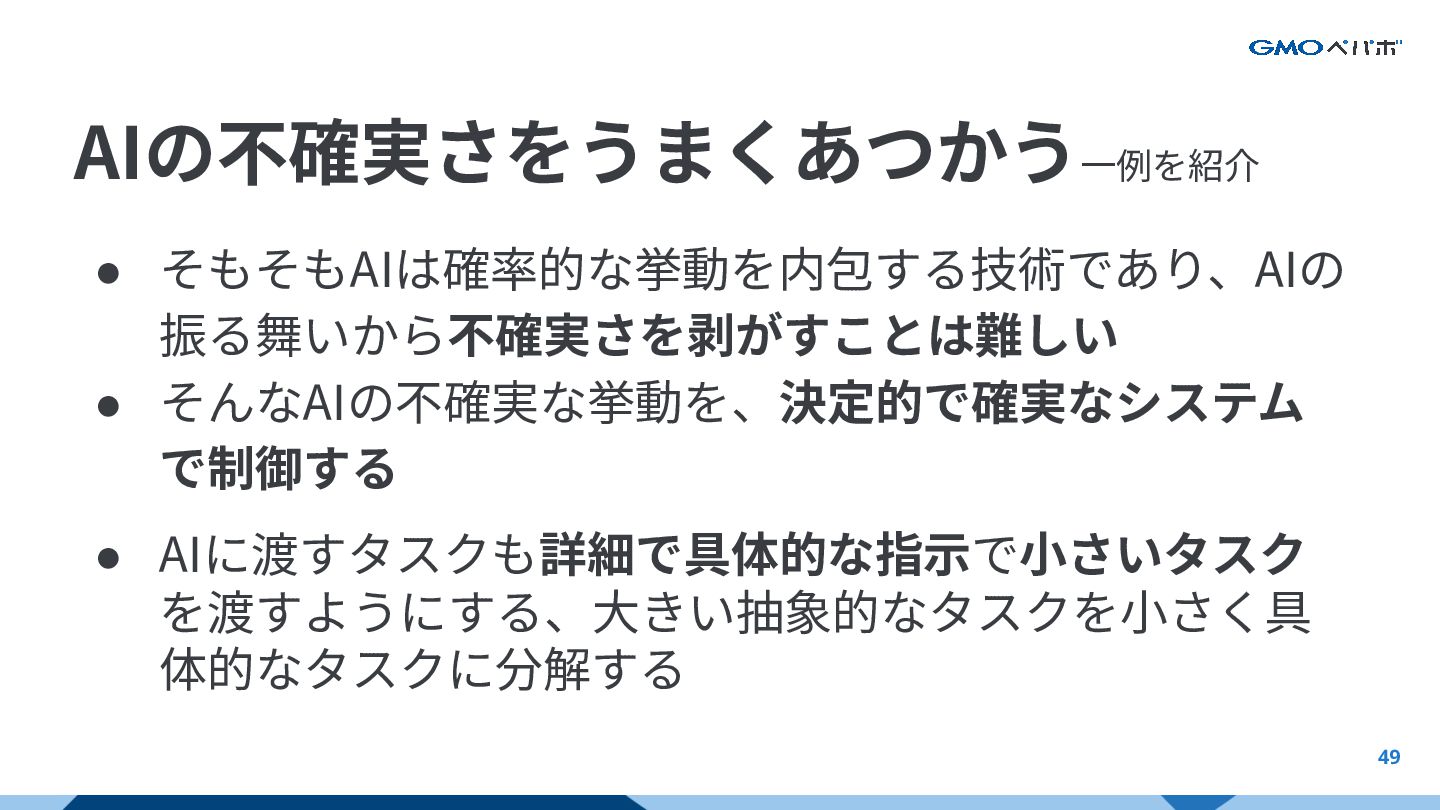 AIの不確実さをうまくあつかう⼀例を紹介 49 • そもそもAIは確率的な挙動を内包する技術であり、AIの 振る舞いから不確実さを剥がすことは難しい • そんなAIの不確実な挙動を、決定的で確実なシステム で制御する • AIに渡すタスクも詳細で具体的な指⽰で⼩さいタスク