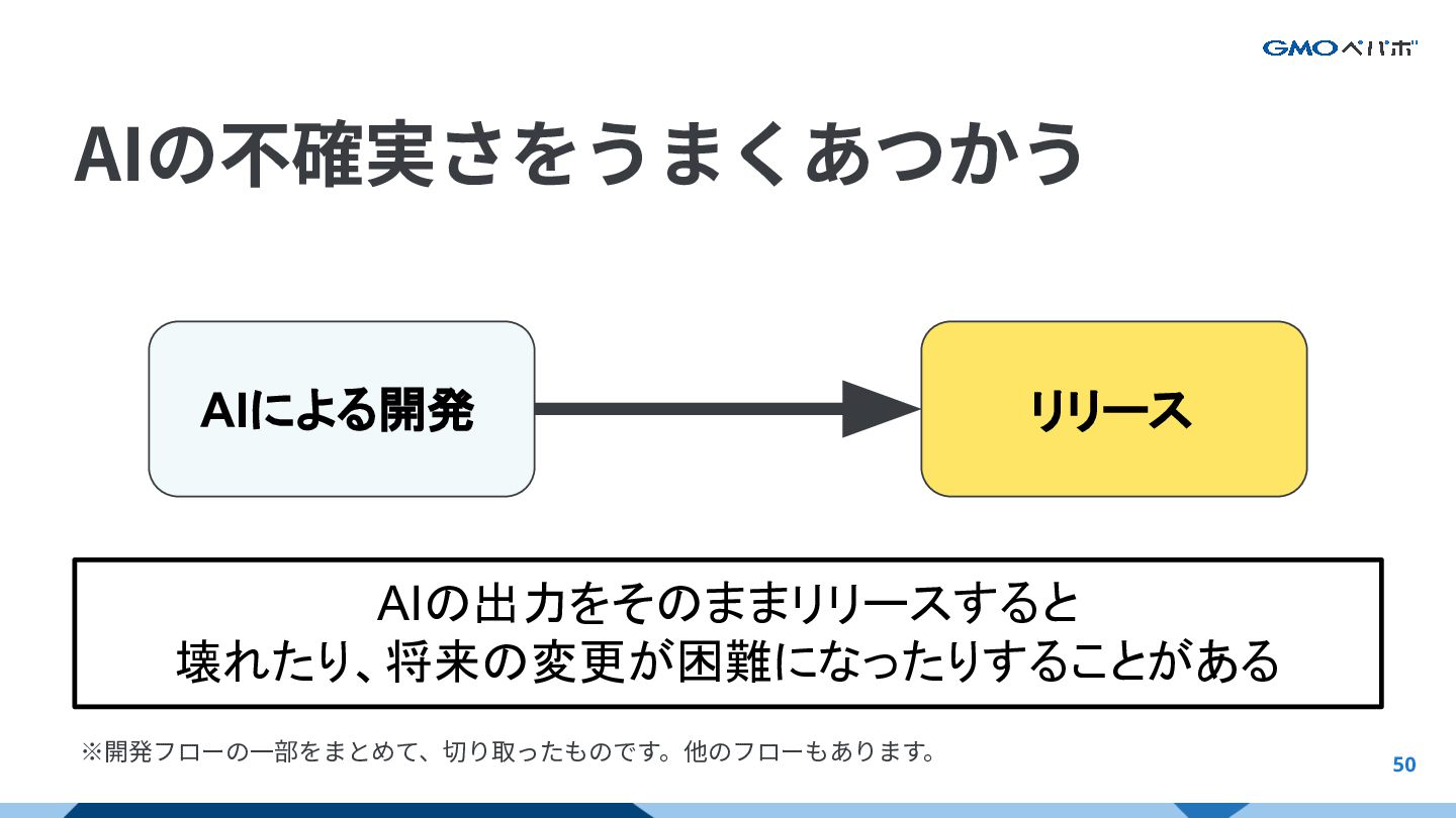 50 AIによる開発 ※開発フローの⼀部をまとめて、切り取ったものです。他のフローもあります。 リリース AIの出力をそのままリリースすると 壊れたり、将来の変更が困難になったりすることがある AIの不確実さをうまくあつかう AIをフルに活かすAI前提