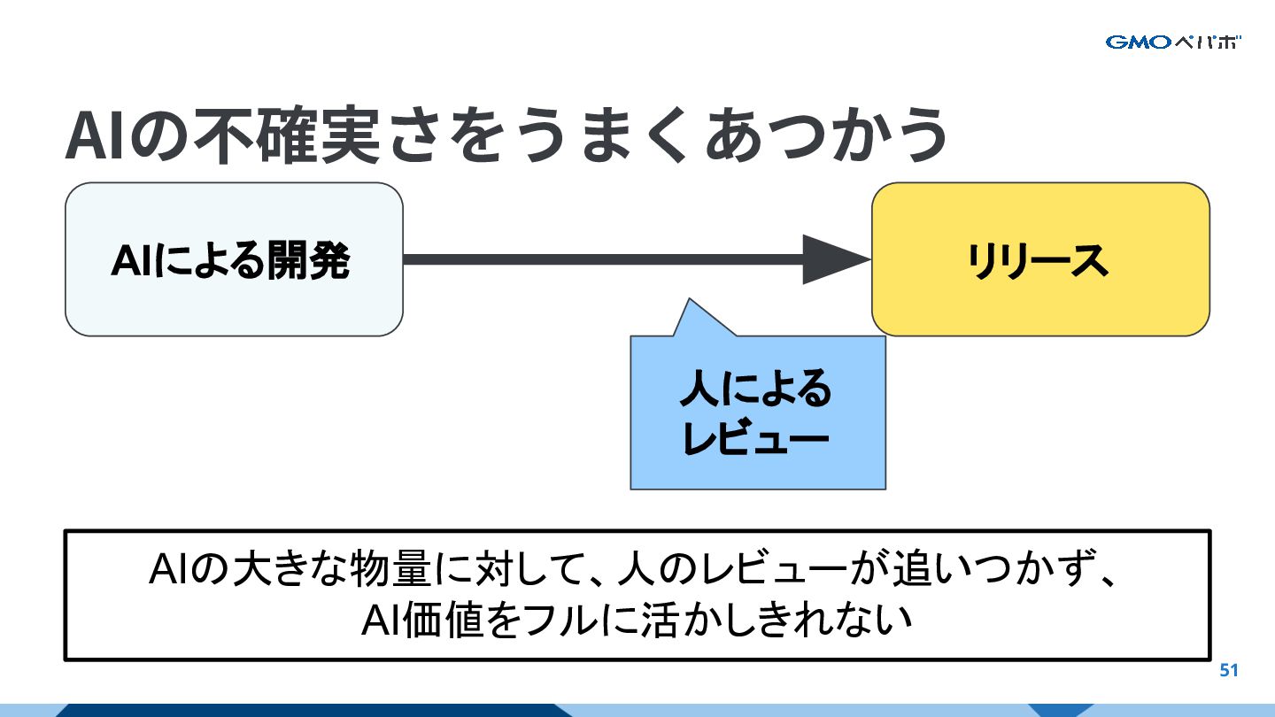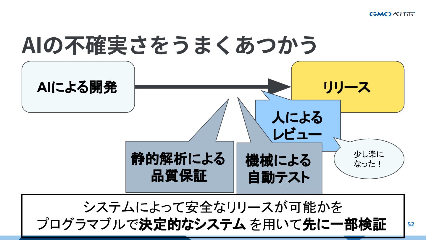 51 AIによる開発 リリース 人による レビュー AIの大きな物量に対して、人のレビューが追いつかず、 AI価値をフルに活かしきれない AIの不確実さをうまくあつかう AIをフルに活かすAI前提