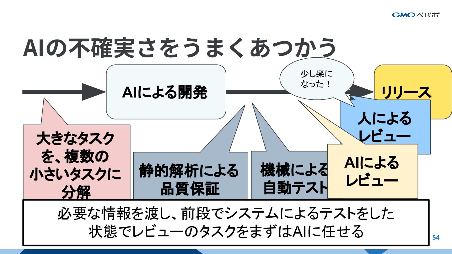 を、複数の 小さいタスクに 分解 AIによる レビュー 必要な情報を渡し、前段でシステムによるテストをした 状態でレビューのタスクをまずはAIに任せる 少し楽に なった! AIの不確実さをうまくあつかう AIをフルに活かすAI前提