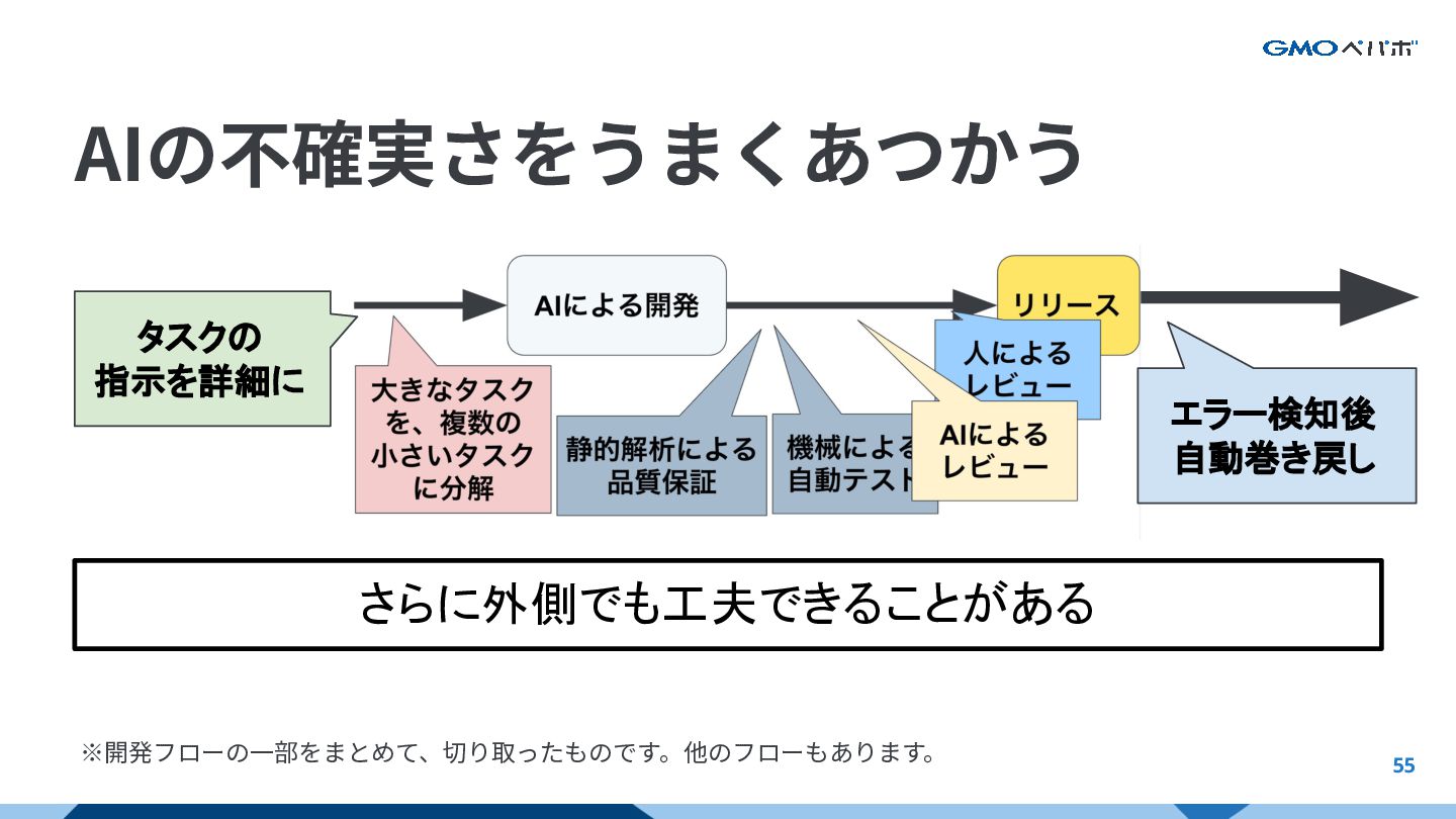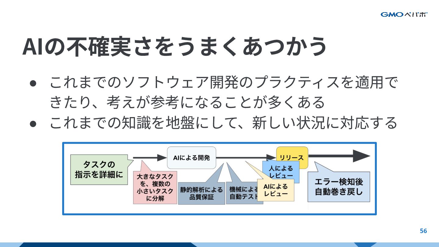 55 ※開発フローの⼀部をまとめて、切り取ったものです。他のフローもあります。 さらに外側でも工夫できることがある タスクの 指示を詳細に エラー検知後 自動巻き戻し AIの不確実さをうまくあつかう AIをフルに活かすAI前提