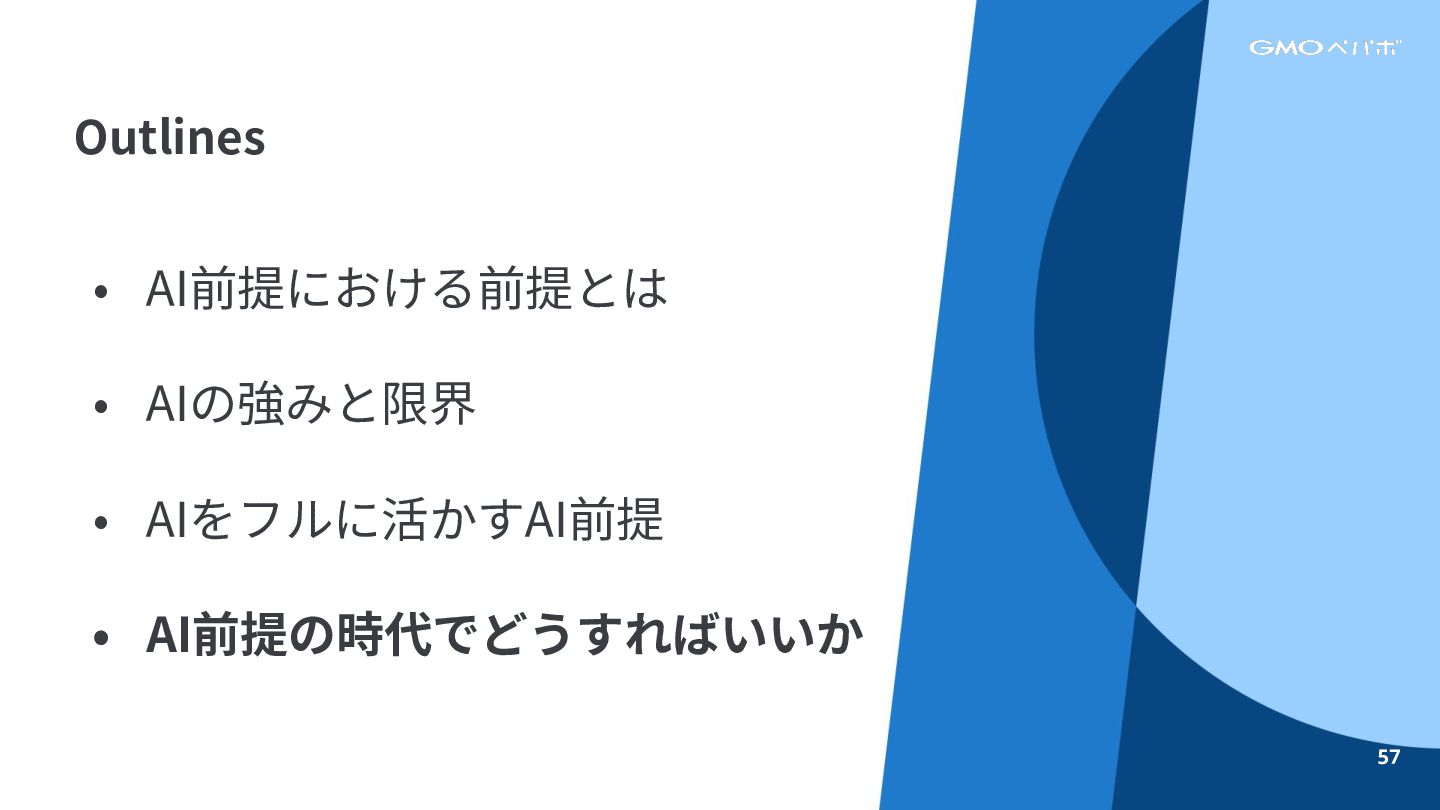 • AI前提における前提とは • AIの強みと限界 • AIをフルに活かすAI前提 • AI前提の時代でどうすればいいか Outlines 57