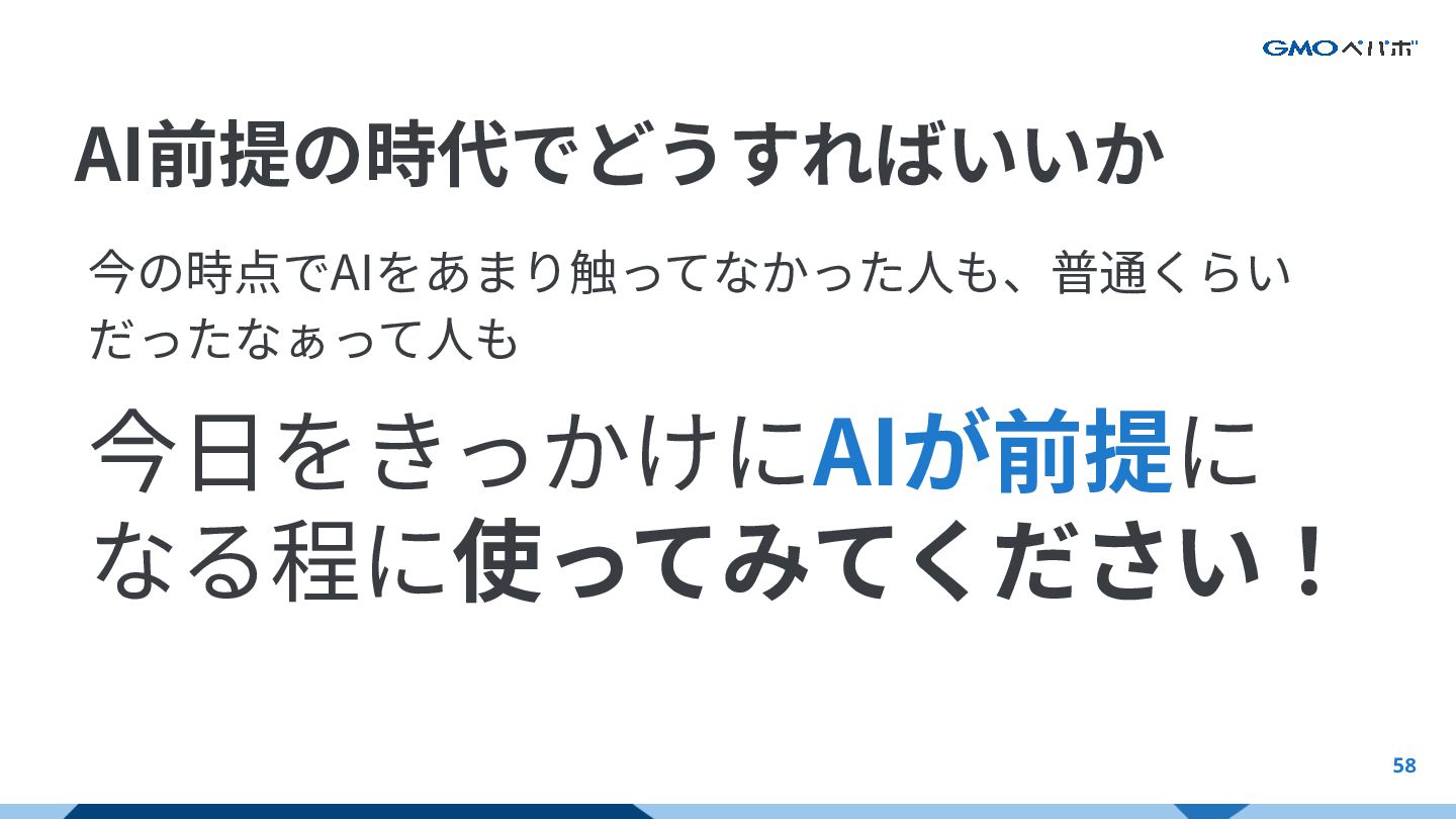 AI前提の時代でどうすればいいか 58 今の時点でAIをあまり触ってなかった⼈も、普通くらい だったなぁって⼈も 今⽇をきっかけにAIが前提に なる程に使ってみてください! AI前提の時代でどうすればいいか