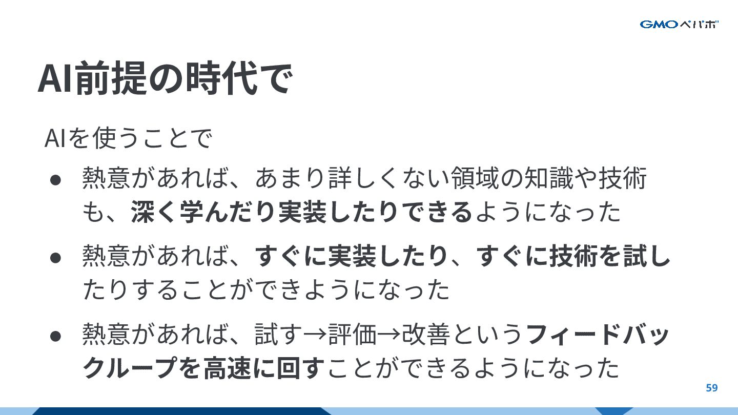熱意があれば、試す→評価→改善というフィードバッ クループを⾼速に回すことができるようになった AI前提の時代でどうすればいいか