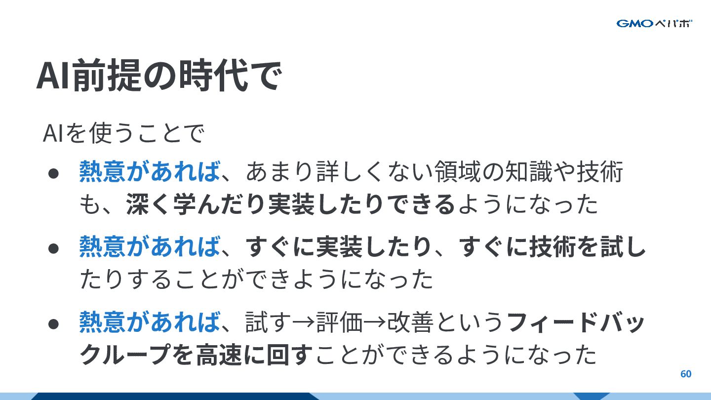 AI前提の時代で 59 AIを使うことで • 熱意があれば、あまり詳しくない領域の知識や技術 も、深く学んだり実装したりできるようになった • 熱意があれば、すぐに実装したり、すぐに技術を試し たりすることができようになった •